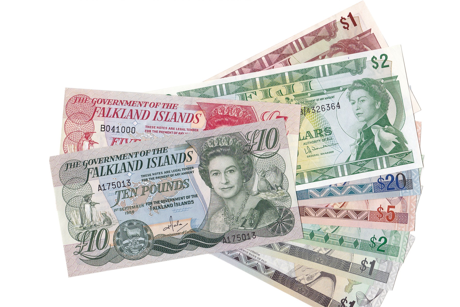 Lot (9) 10 Pounds 1-9-1986 en 5 Pounds 14-6-2005 Falklands Islands + verschillende denominaties Fiji o.a. 20 Dollars ND (1992). Pick 14a, 17a, 71a, 72c, 76a, 87a, 91a, 95. Almost UNC.