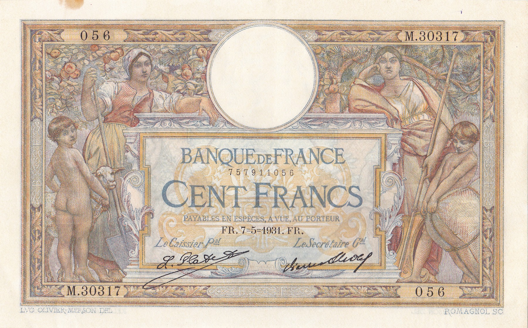 100 Francs FR. 7-5-1931 FR. Pick 78b [# M.30317 056]. VF+.