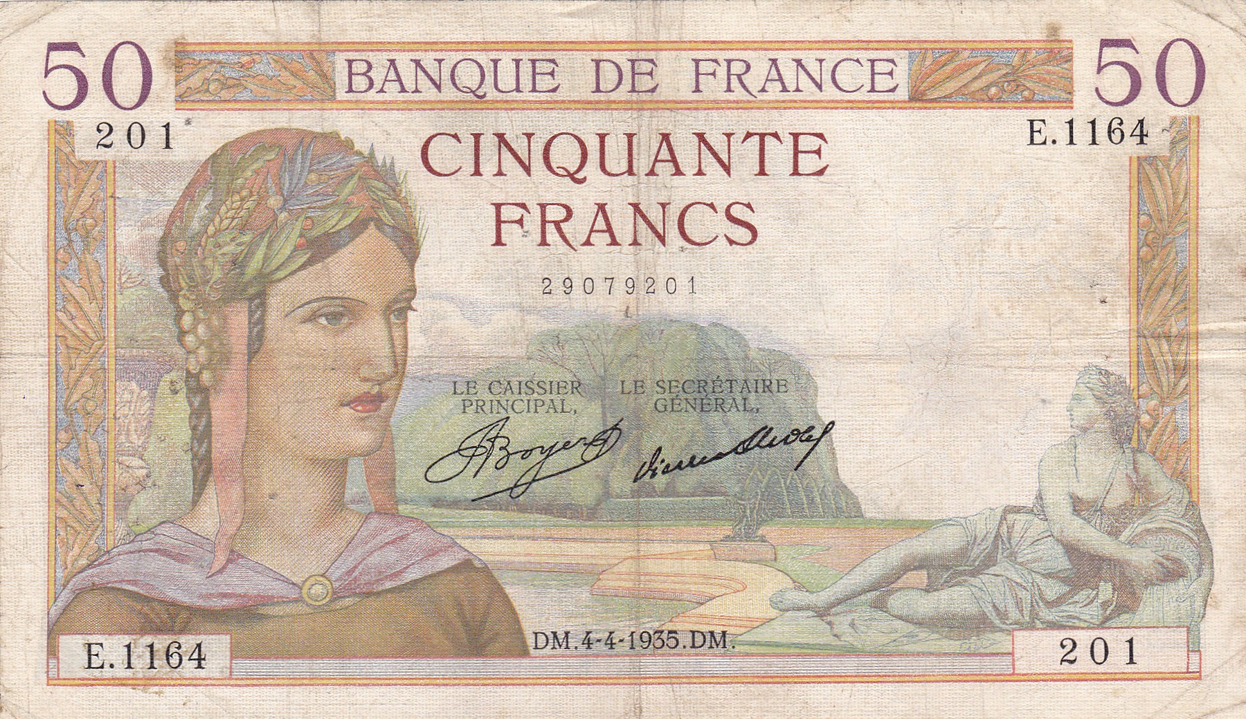 50 Francs DM. 4-4-1935 DM. Pick 81 [# E.1164 201]. Fine.