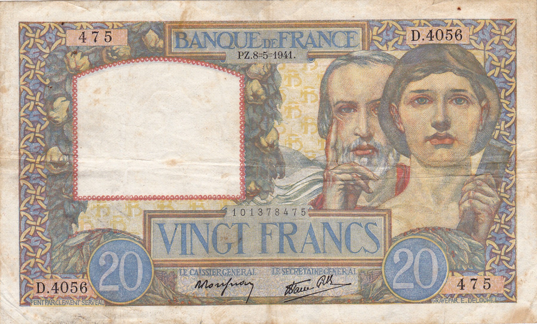 20 Francs PZ. 8-5-1941. Pick 92 [# D.4056 475]. Fine / VF.
