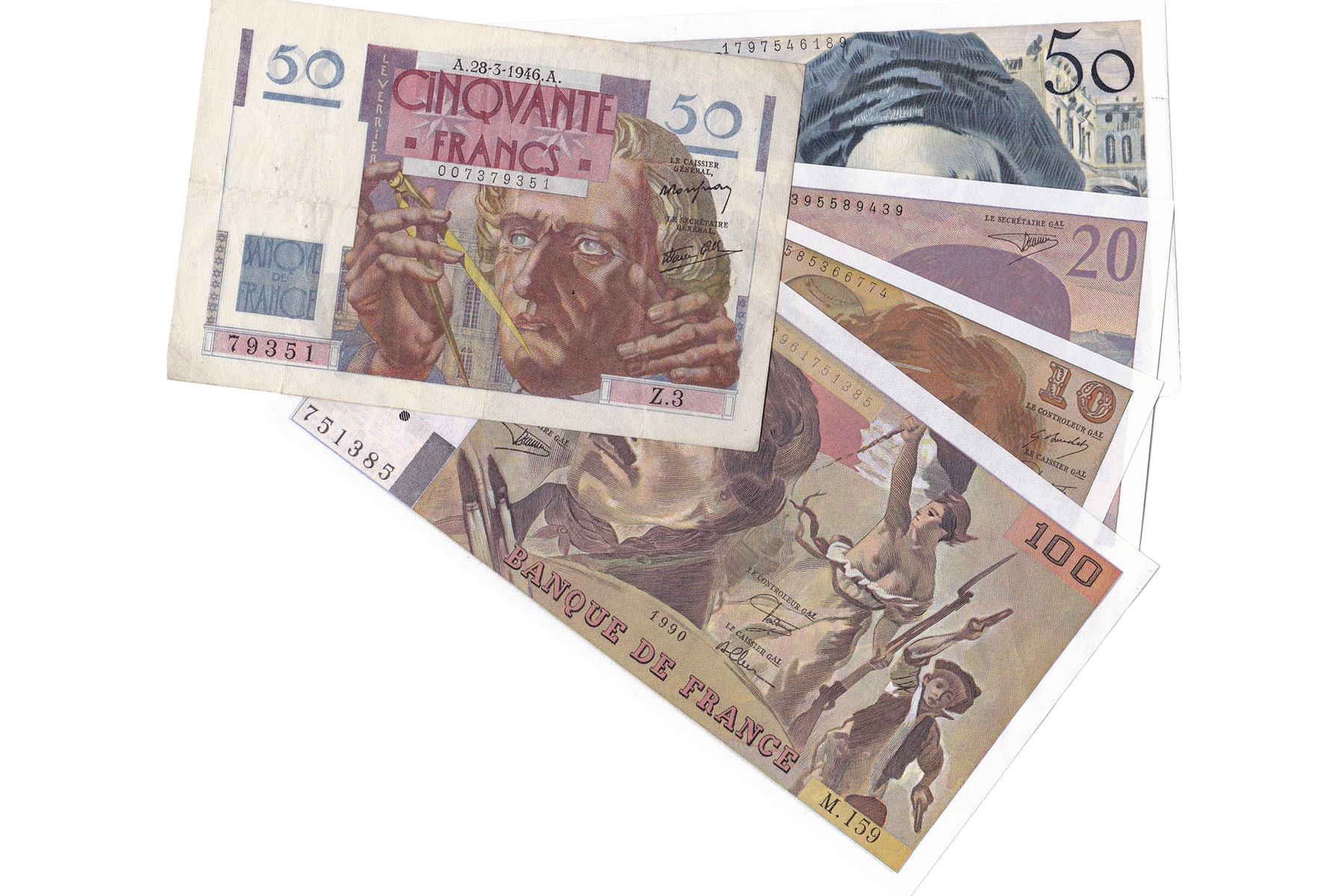 Lot (5) verschillende denominaties France, o.a. 50 Francs 28-3-1946 en 100 Francs 1990. Pick 127a, 150c, 151, 152f, 154c. VF and better. Also UNC.