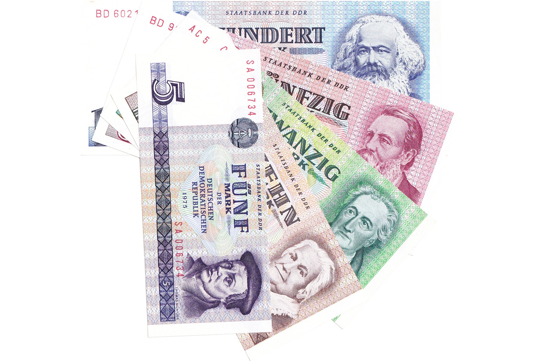 Inwisselset 1989 DDR naar WDR Mark – 5, 10, 20, 50 en 100 Mark. FDC / UNC.