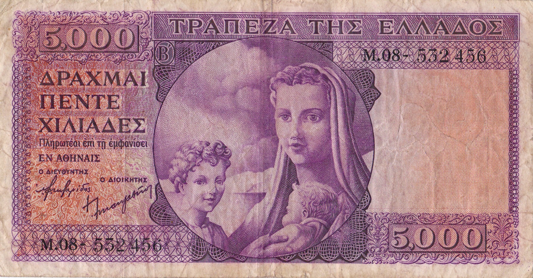 5000 Drachmai ND (1947). Pick 177a [# M.08. 552456]. Fine+.