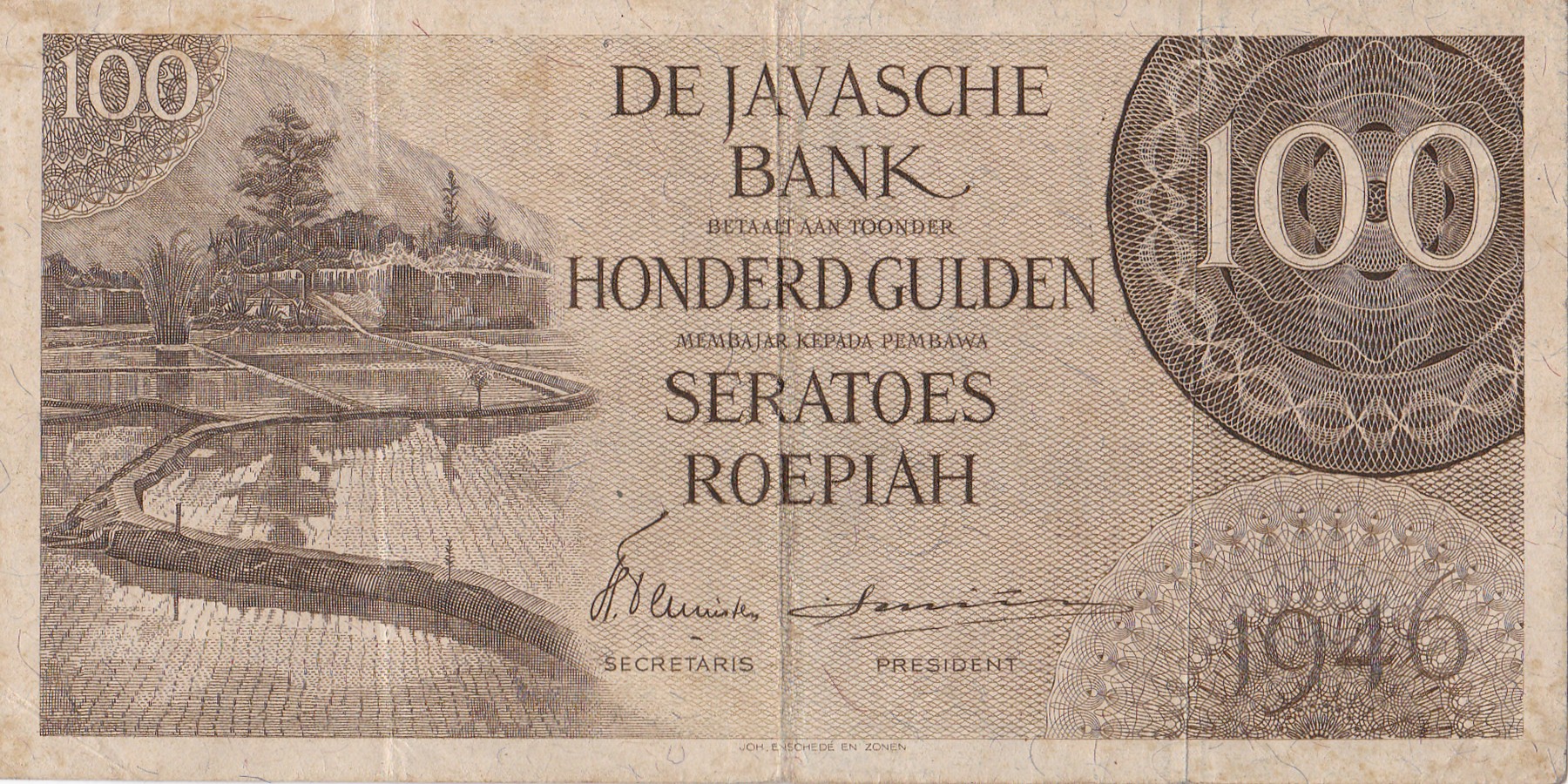 100 Gulden 1946 Rijstvelden / rice fields. Pick 94; PL NI-29A.5a [# SO 075978]. Almost VF.