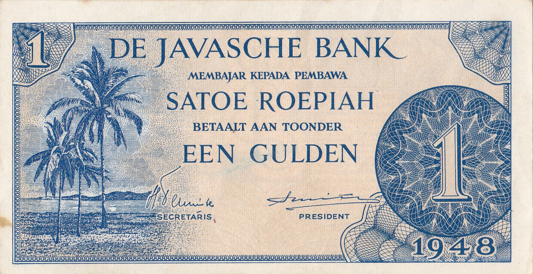 1 Gulden / Satoe Roepiah 1948 Palm trees, no serial number. Comp. Pick 98; PL NI-131.2p1. EF/UNC.