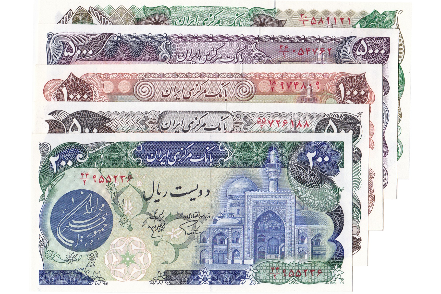 Lot (5) complete serie 1981 ND issue, 200 Rials t/m 10.000 Rials. Pick 127 t/m 131. Almost UNC.