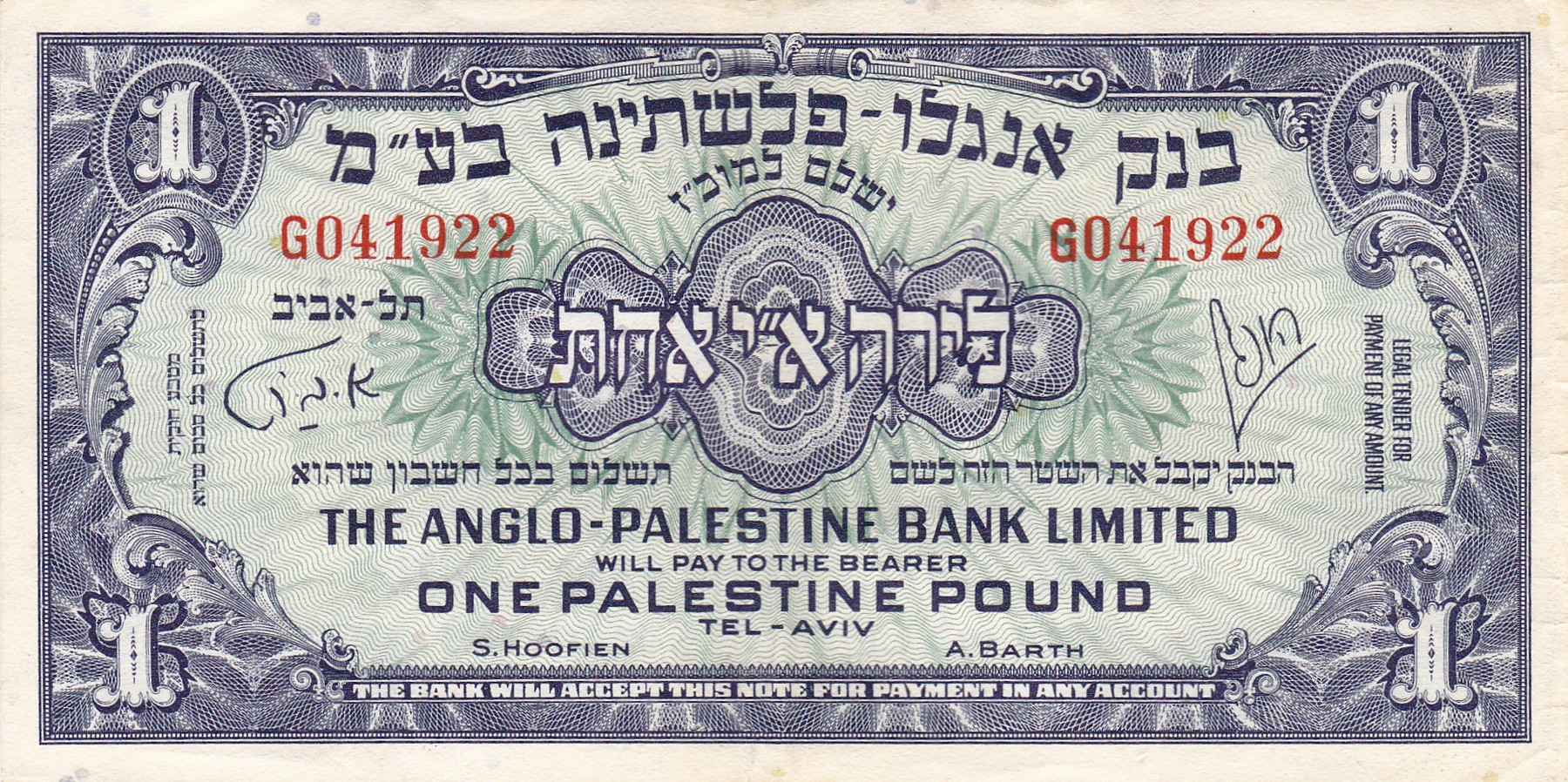 1 Pound ND (1948-1951), Anglo Palestine Bank Limited. Pick 15 [# G041922]. VF.