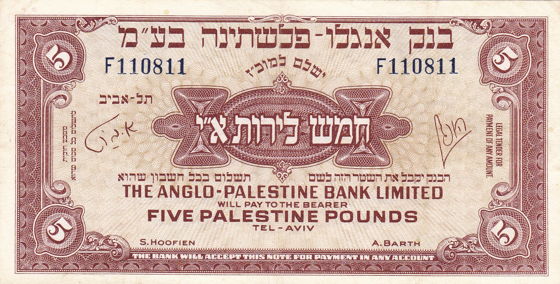 5 Pounds ND (1948-1951), Anglo Palestine Bank Limited. Pick 16 [# F110811]. VF.