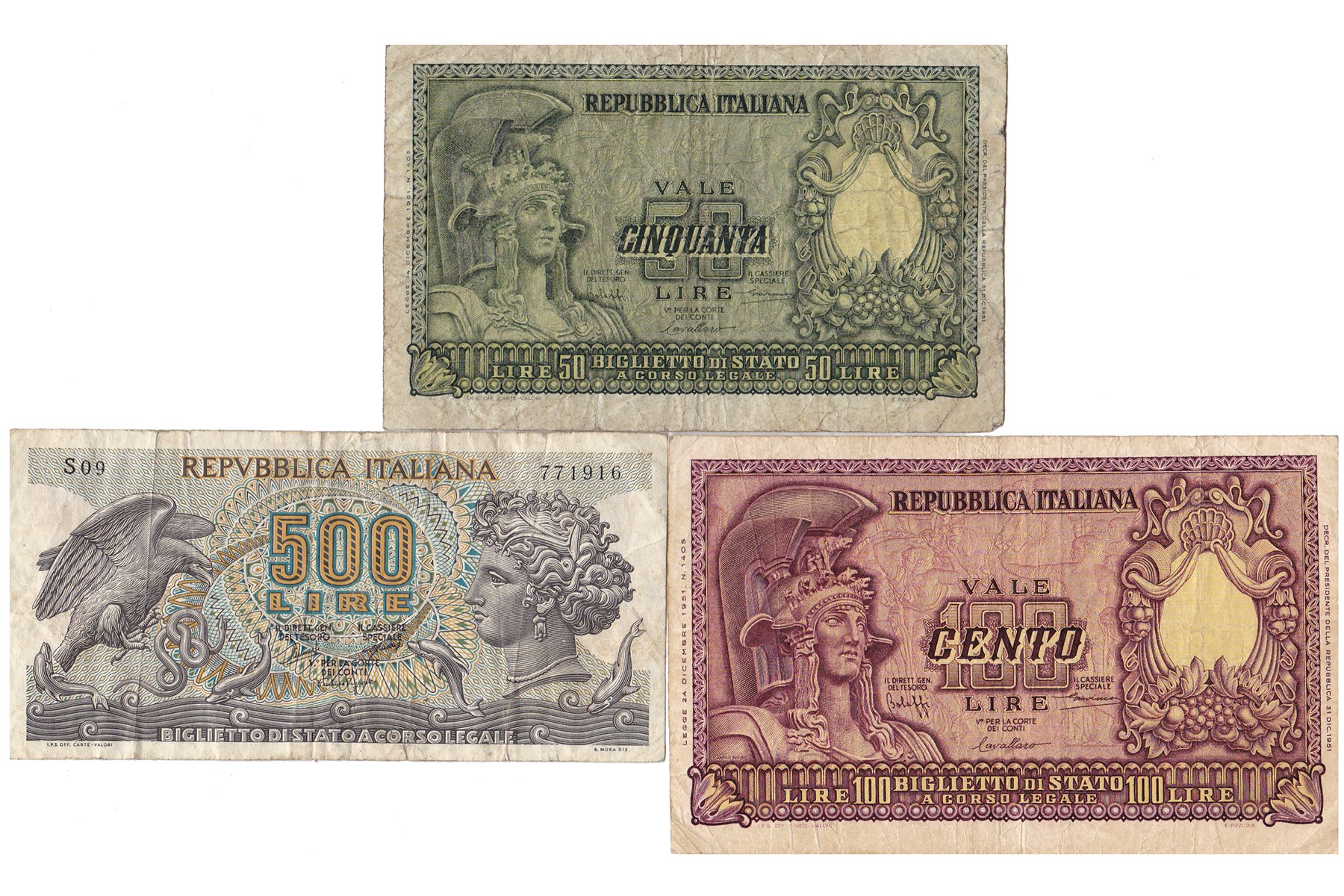 Lot (3) 50 en 100 Lire 31-12-1951; 500 Lire 1966 issue. Pick 91a, 92a, 93a. VF.