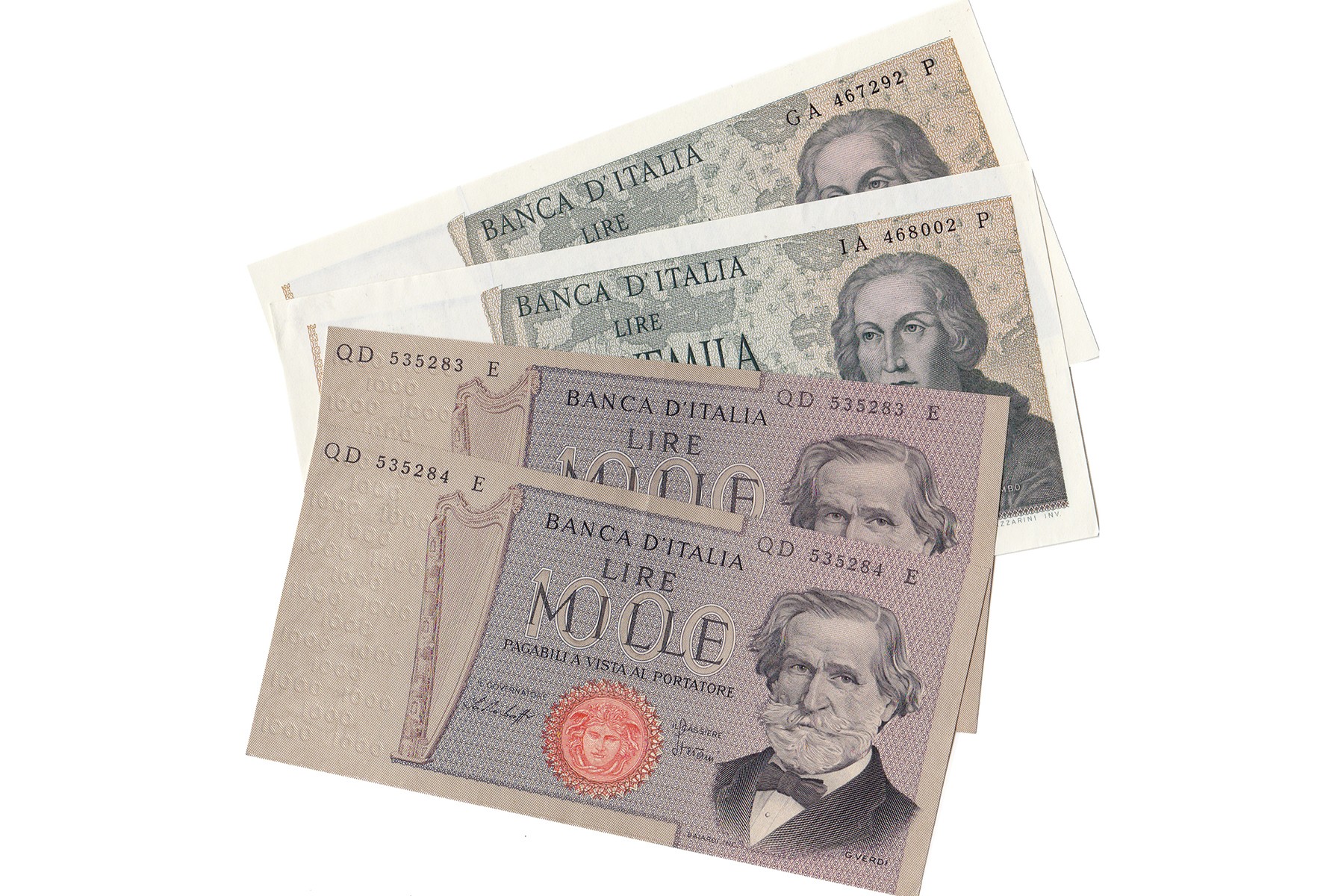 Lot (4) 1000 Lire en 5000 Lire 1969; 1971 issue. Pick 101f (2), 102b (2). VF and better.