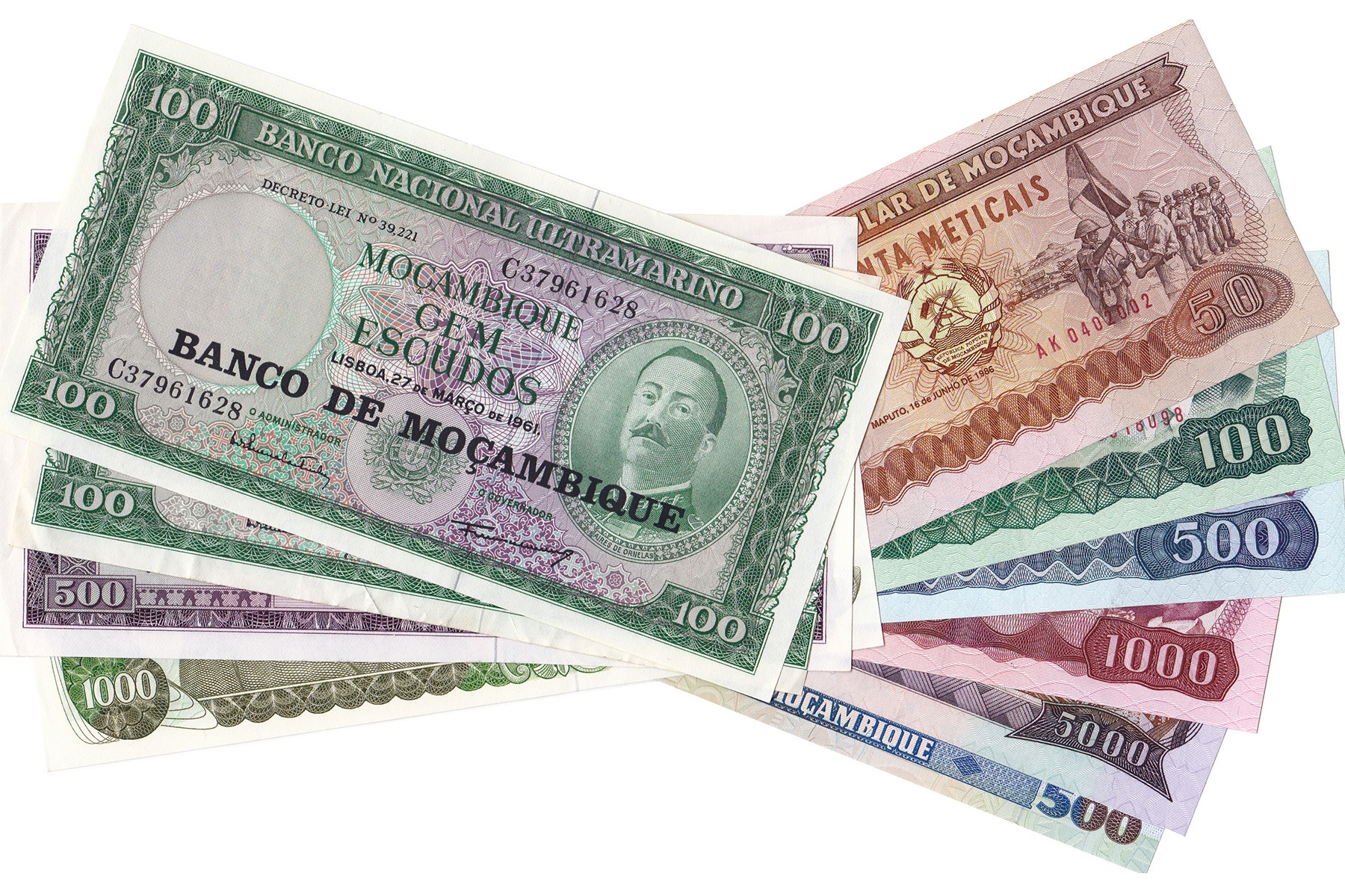 Lot (10) verschillende denominaties Mozambique periode 1961 t/m 1993 o.a. 500 Escudos 22-3-1967 en 1000 Escudos 23-5-1972. Pick 109, 110, 115, 129b, 130a, 127, 132a, 133a, 134. Almost UNC.