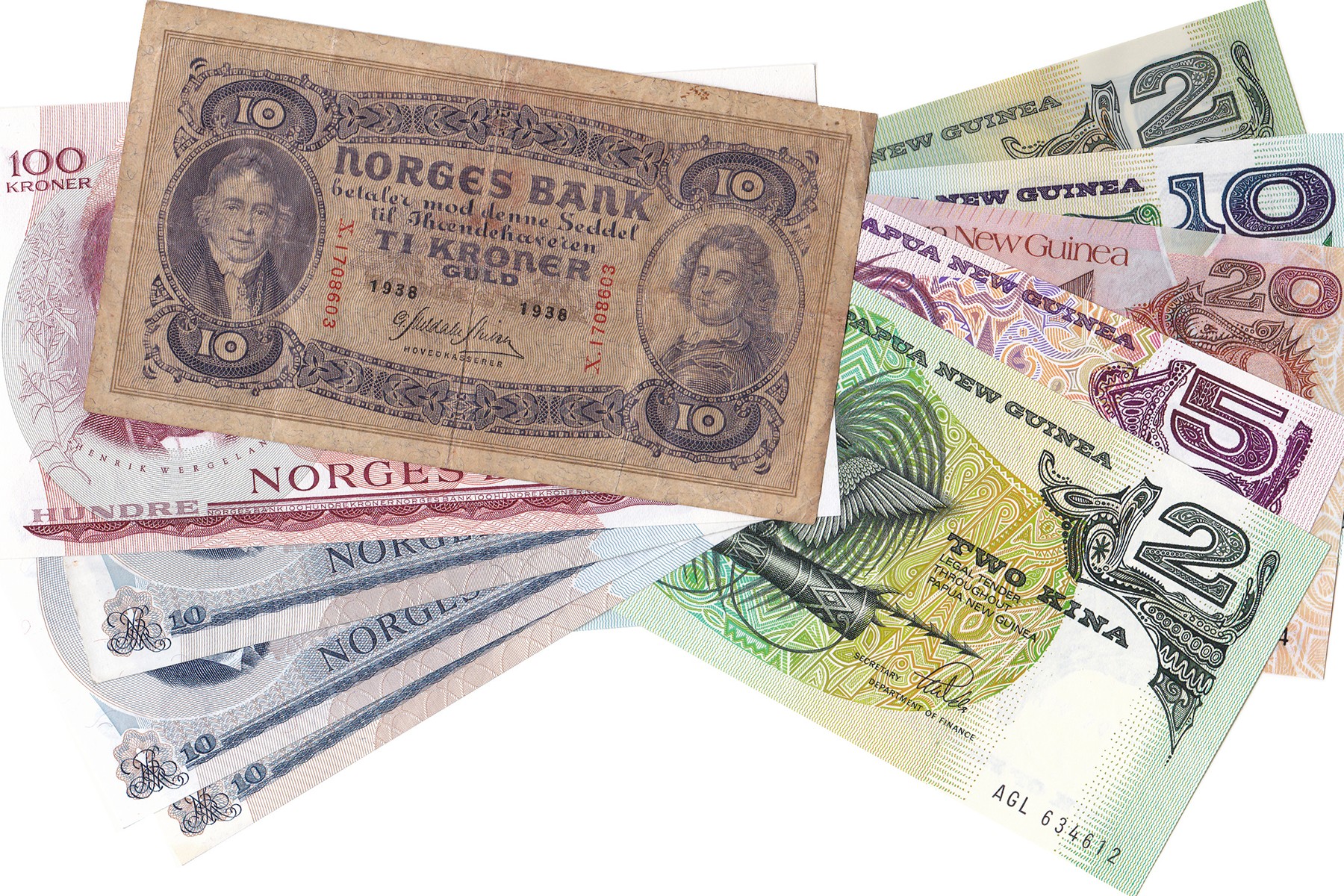 Lot (12) verschillende denominaties Norway en New Guinea. Pick 8c, 38h, 36b, 36c; 5 t/m 7, 12, 36. VF and mostly UNC.