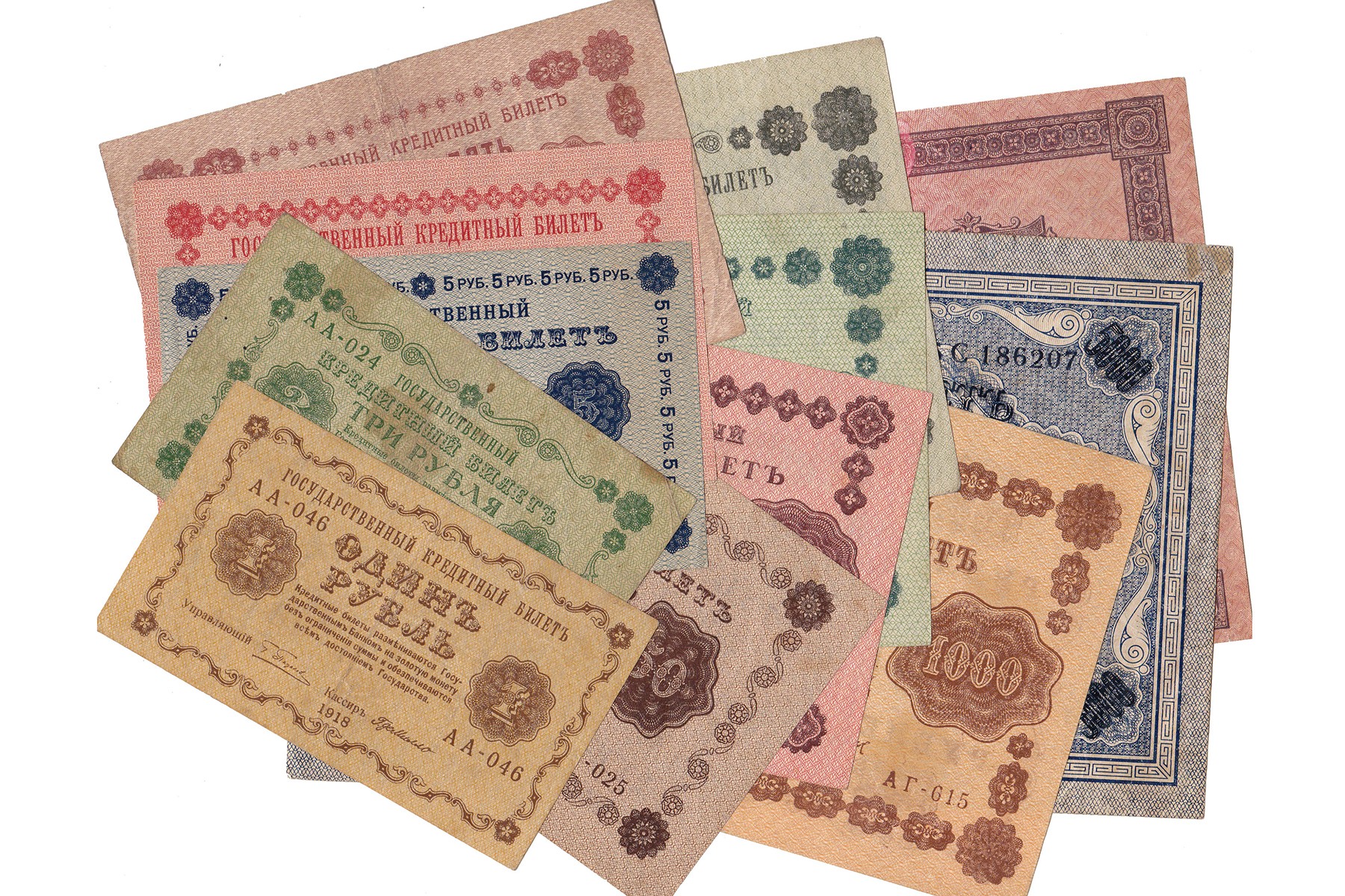 Lot (12) complete serie 1918 issue 1 Ruble t/m 10.000 Rubles. Pick 86 t/m 97. VF and better.