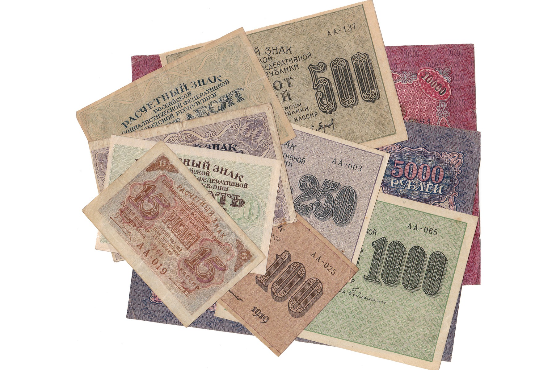 Lot (10) complete serie 1919-1920 ND issue 15 Rubles t/m 10.000 Rubles. Pick 98 t/m 106. VF and better.