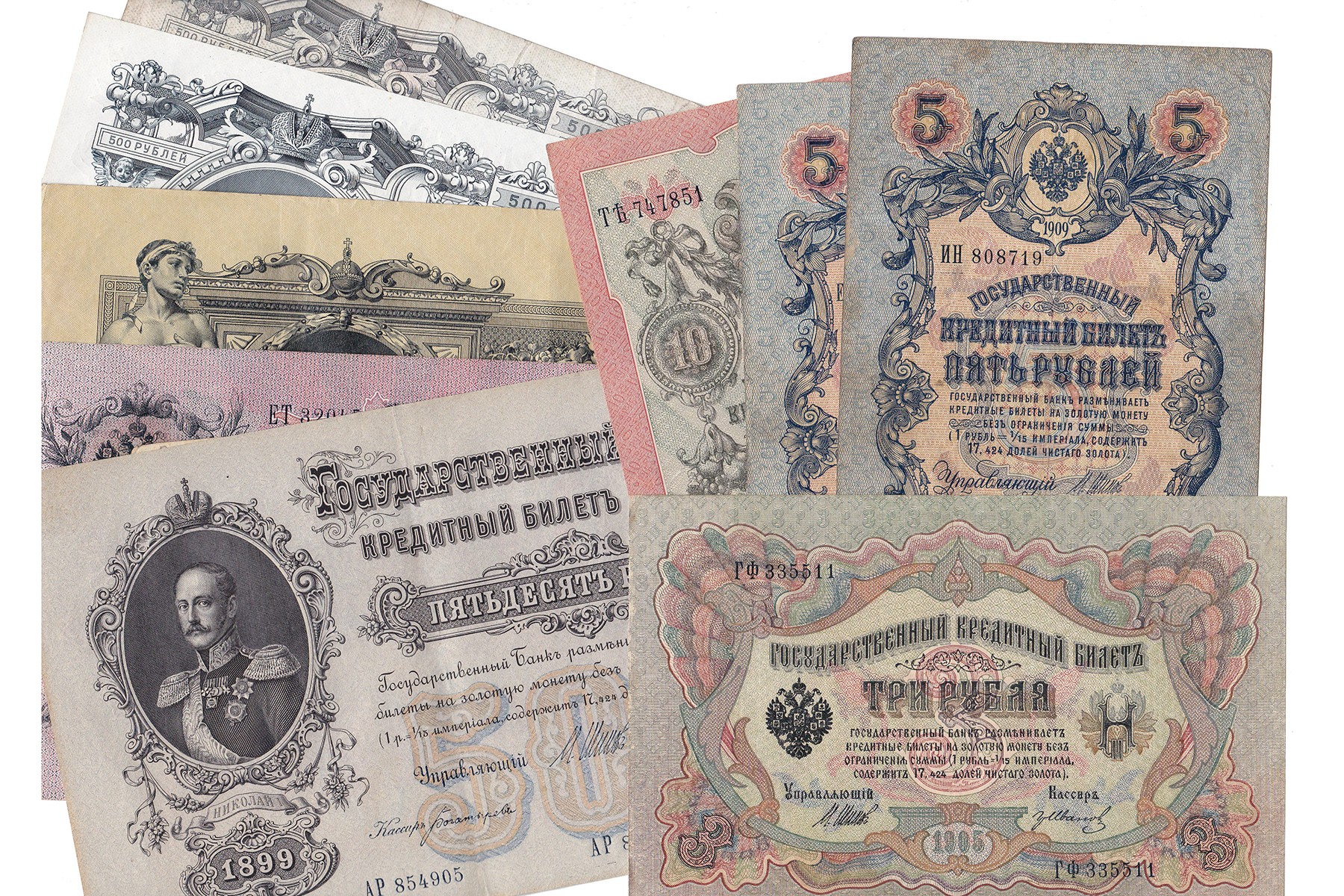 Lot (10) 1 Ruble 1898, 50 Rubles 1899 + verschillende denominaties 1905 t/m 1912 issue. Pick 1a, 8d, 9c, 10b, 14b (3), 13, 12. VF.