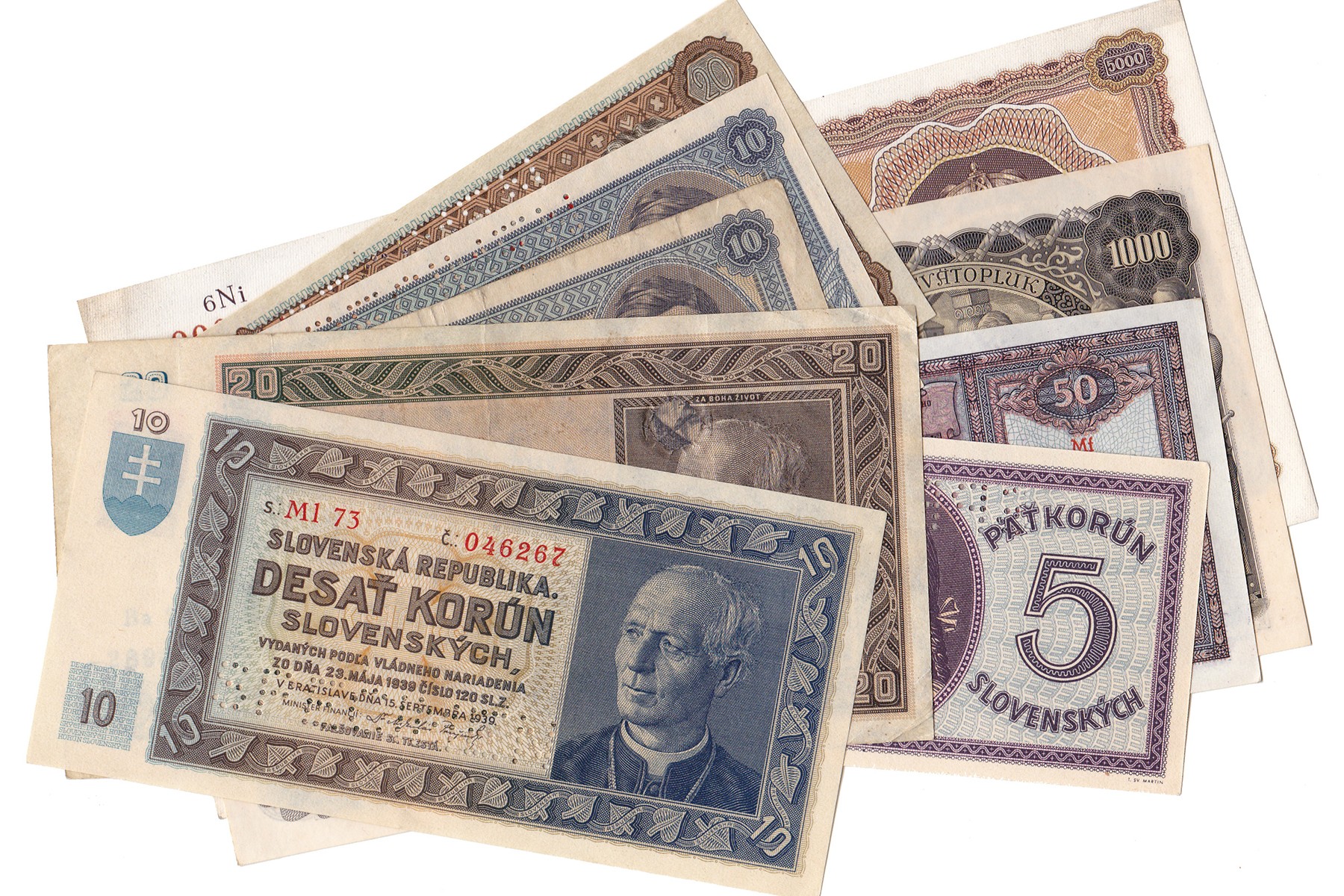 Lot (9) verschillende denominaties Slovakia periode 1939-1944 o.a. 20 Korun 1939 Specimen en 1000 Korun 1940. Pick 4s, 5s, 6, 6s, 7s, 8s, 9s, 13, 14s. Fine / VF and better.