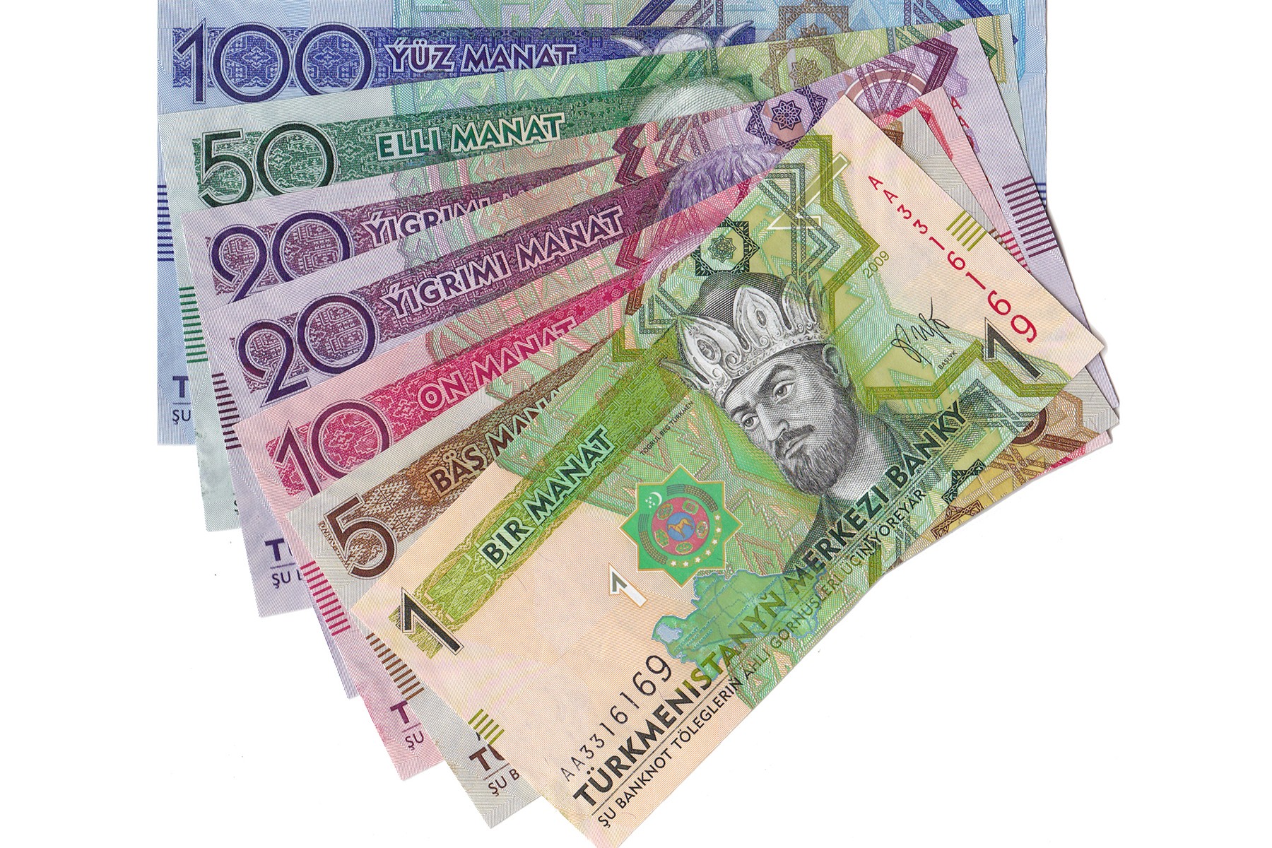 Lot (6) vrijwel complete serie Turkmenistan 2009 issue 1 Manat t/m 100 Manat. Pick 22 t/m 27. Almost UNC.