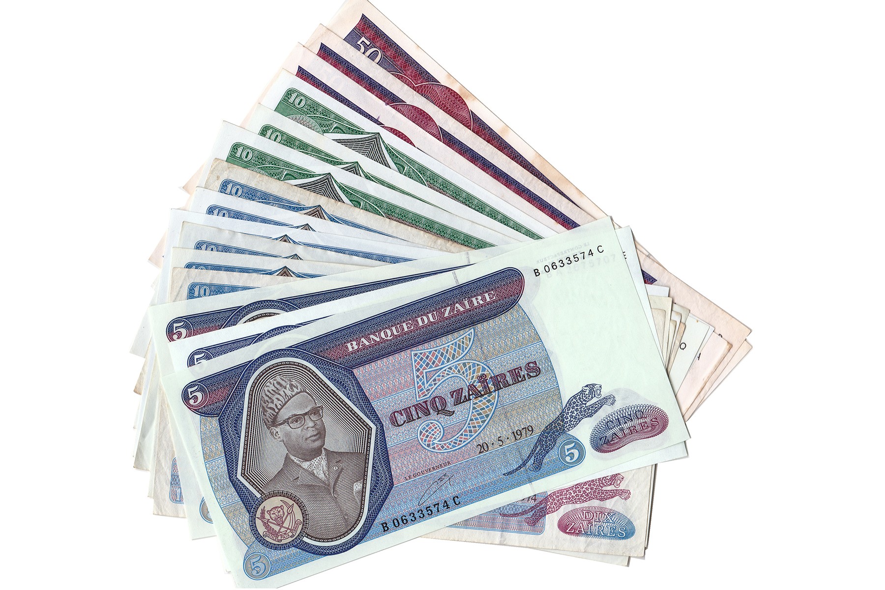 Lot (15) 5 Zaire t/m 50 Zaires 1971-1980 issues, vrijwel compleet op Pick-nummer verzameld incl. variaties. Pick 22a, 22b, 22s, 23a (3), 23b (3), 24a, 24b, 24s, 25a, 25b, 25s. VF and better.