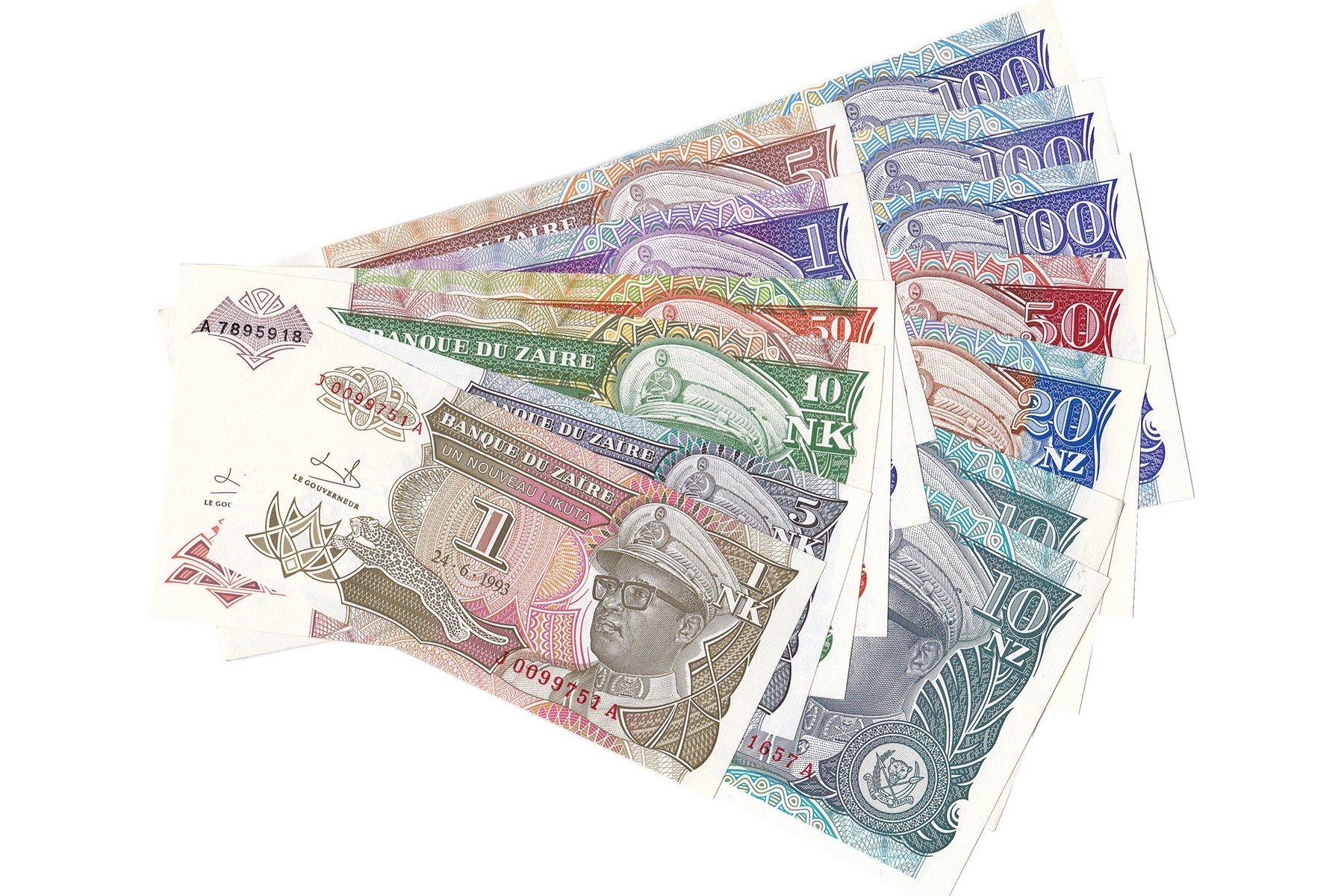 Lot (13) vrijwel complete serie 1993 issue 1 Nouveau Likuta t/m 100 Nouveaux Zaires. Pick 47 t/m 58 (m.u.v. 47s, 48s, 52s, 53b, 54s). Almost UNC.