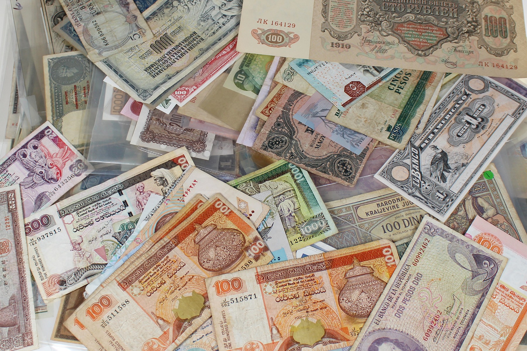 Schoenendoos met biljetten uit verschillende landen. Diverse kwaliteiten.