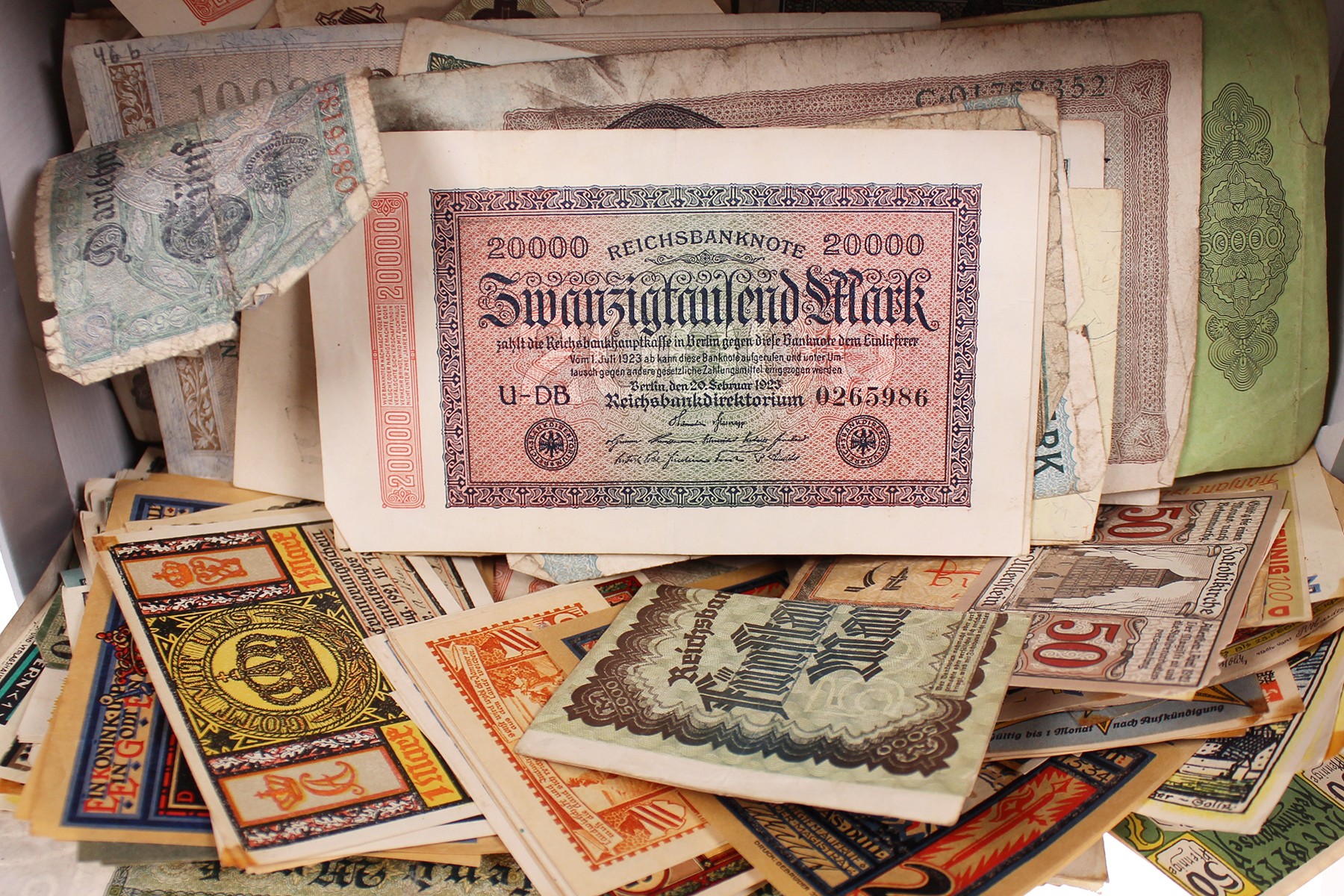Schoenendoos vol met bankbiljettenspul. Voornamelijk onuitgezocht Duits inflatie- en noodgeld. Banknoten A t/m Z.