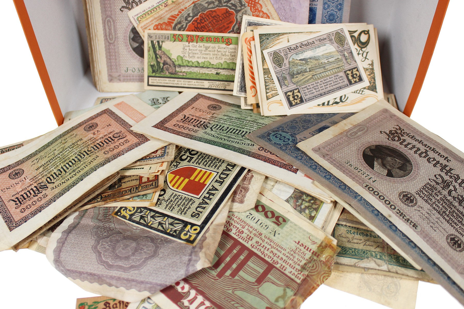 Schoenendoos vol met bankbiljettenspul. Voornamelijk onuitgezocht Duits inflatie- en noodgeld. Banknoten A t/m Z.