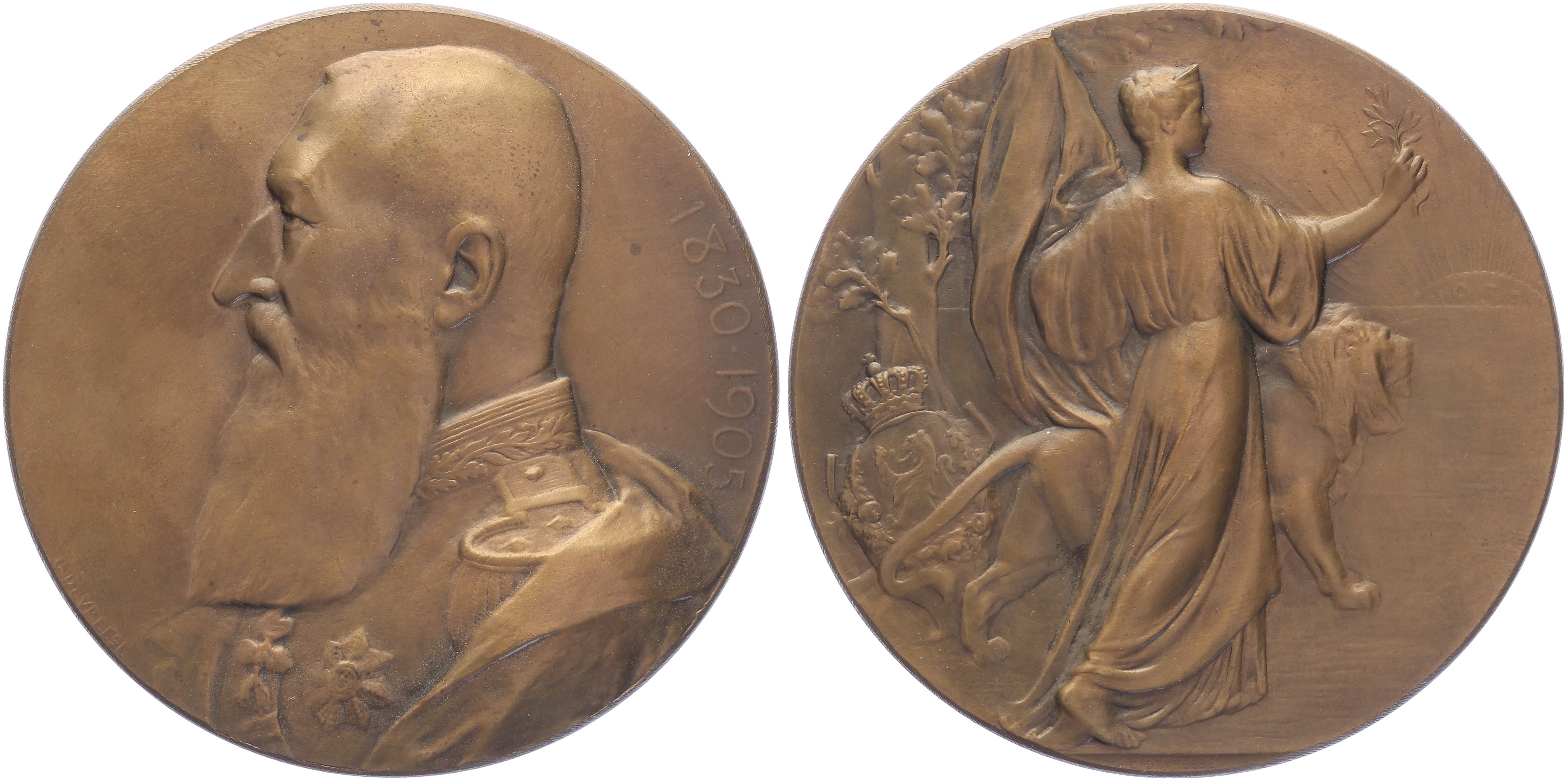 1905 75 Jaar Belgische Onafhankelijkheid. Buste Leopold II naar links. / Staande België met leeuw en wapenschild. Æ 70,4. In originele doos. Willenz 44; PVD 48. Prachtig.