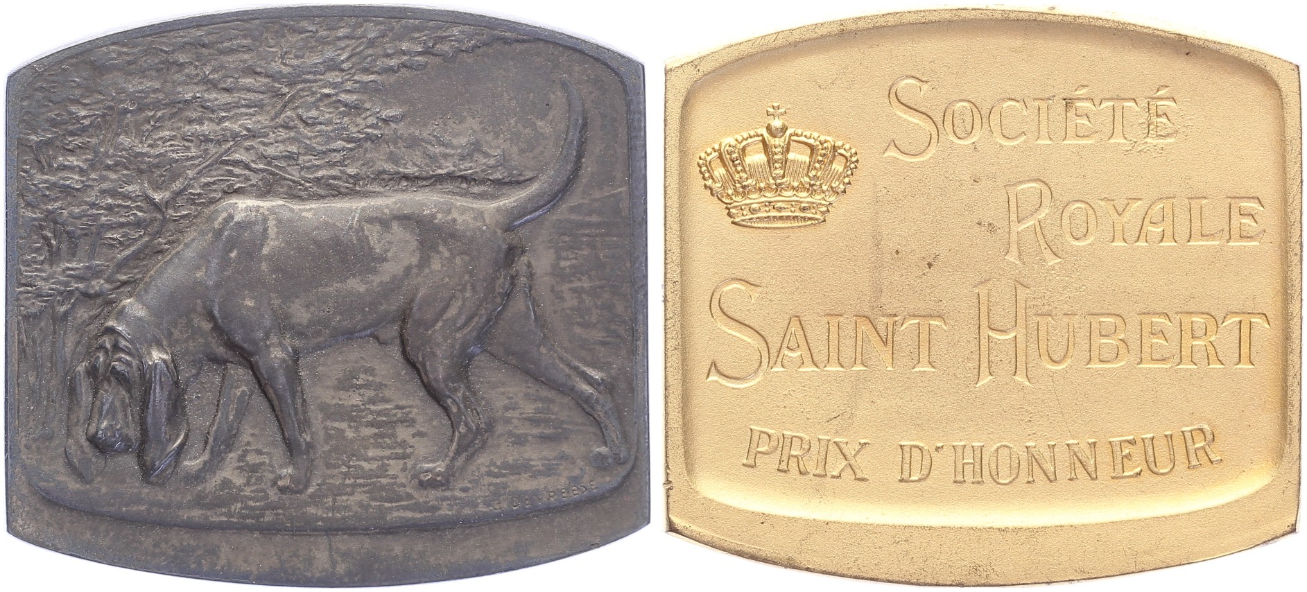 Lot (2) (1908/1909) Jachtvereeniging “St. Hubert”. Jachthond in bos volgt spoor. / Diverse keerzijdes (kz4 + kz8). AR + AR verguld 42 x 39 in originele doosjes. Willenz 73; PVD 80. Prachtig.