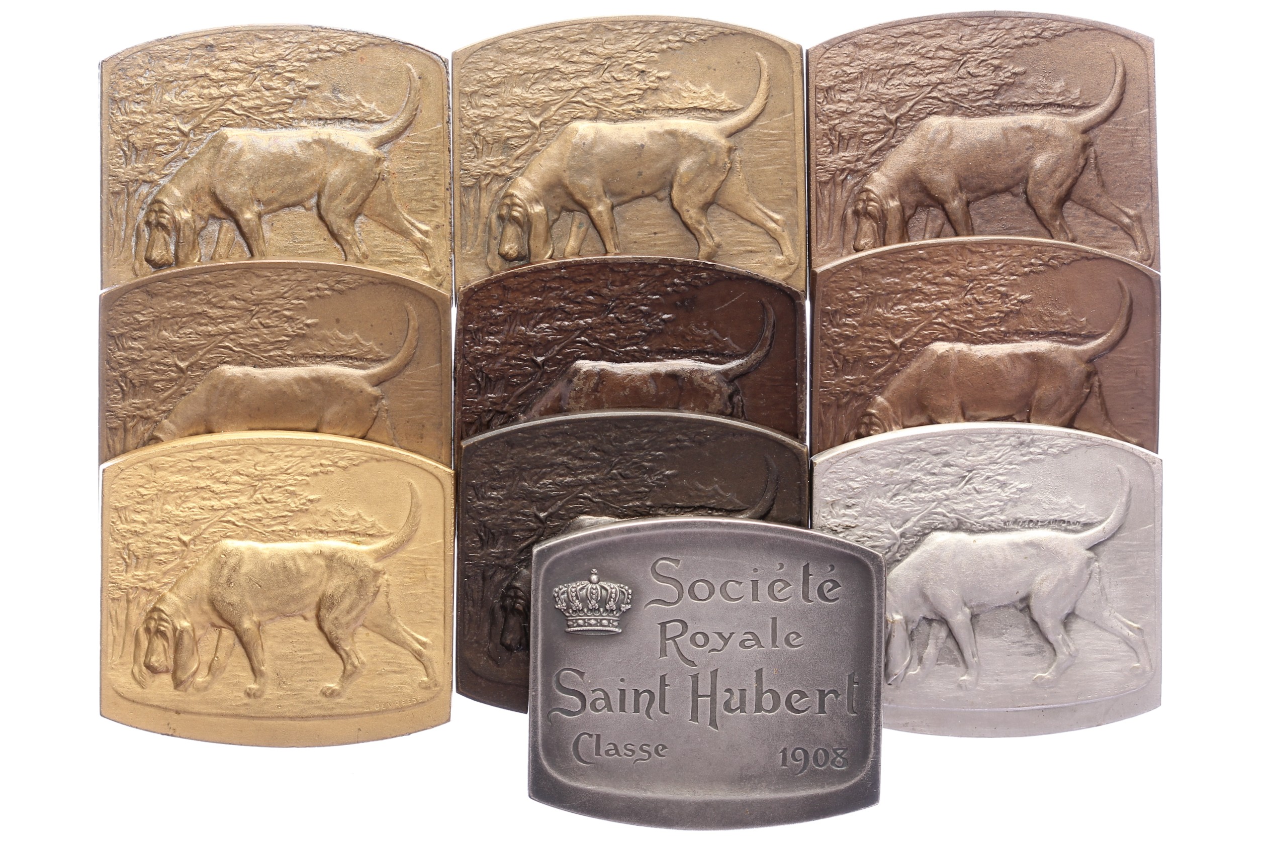 Lot (10) (1908/1909) Jachtvereeniging “St. Hubert”. Jachthond in bos volgt spoor. / Diverse keerzijdes. AR + Æ + Æ verguld 42 x 39. Willenz 73; PVD 80. Prachtig.