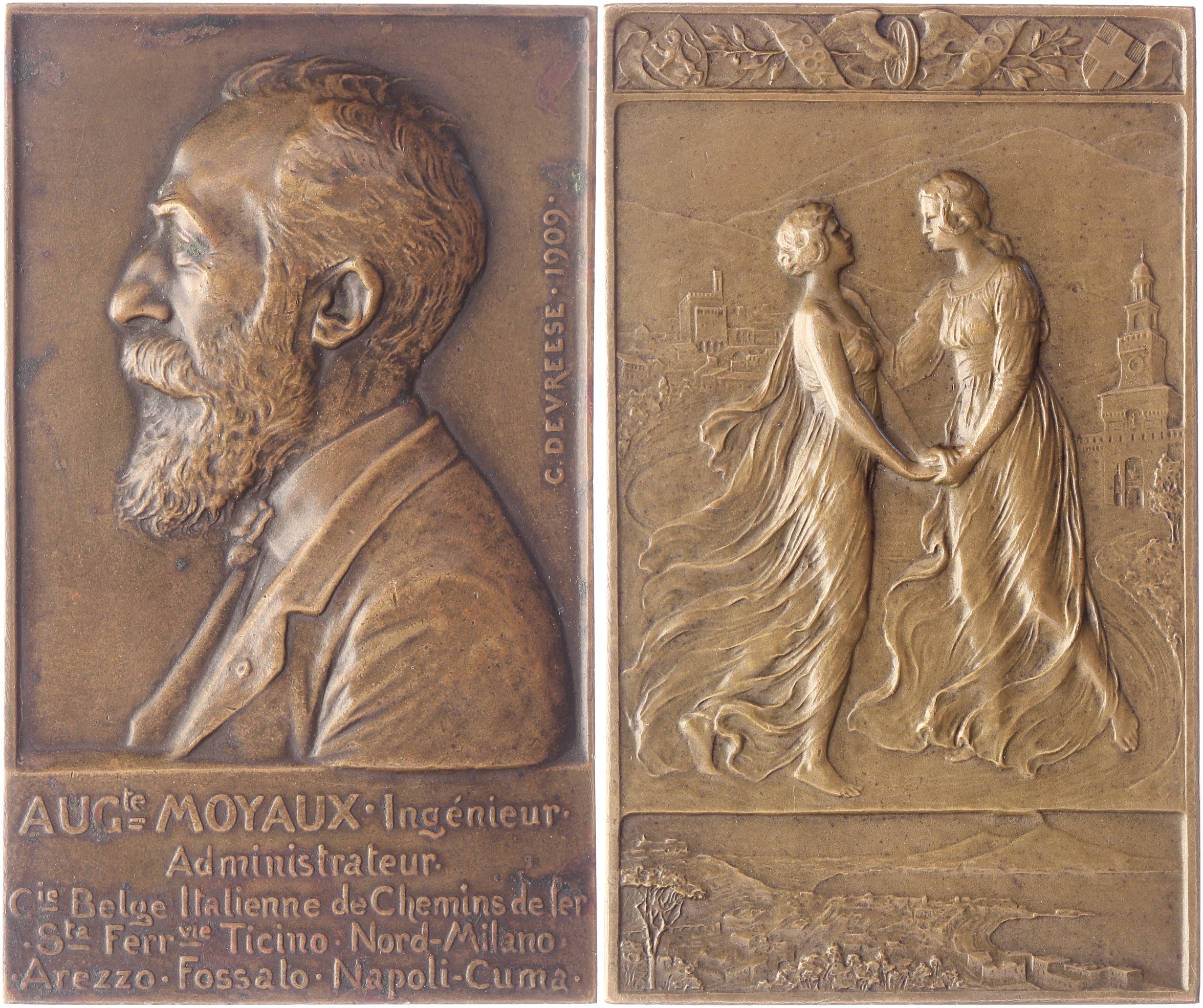 1909 Ter ere van Auguste Moyaux, treinfanaat. Buste naar links. / Twee vrouwen geven elkaar de hand met Italiaanse achtergrond. Æ 80,3 x 48. Willenz 91; PVD 100. Zeer fraai.