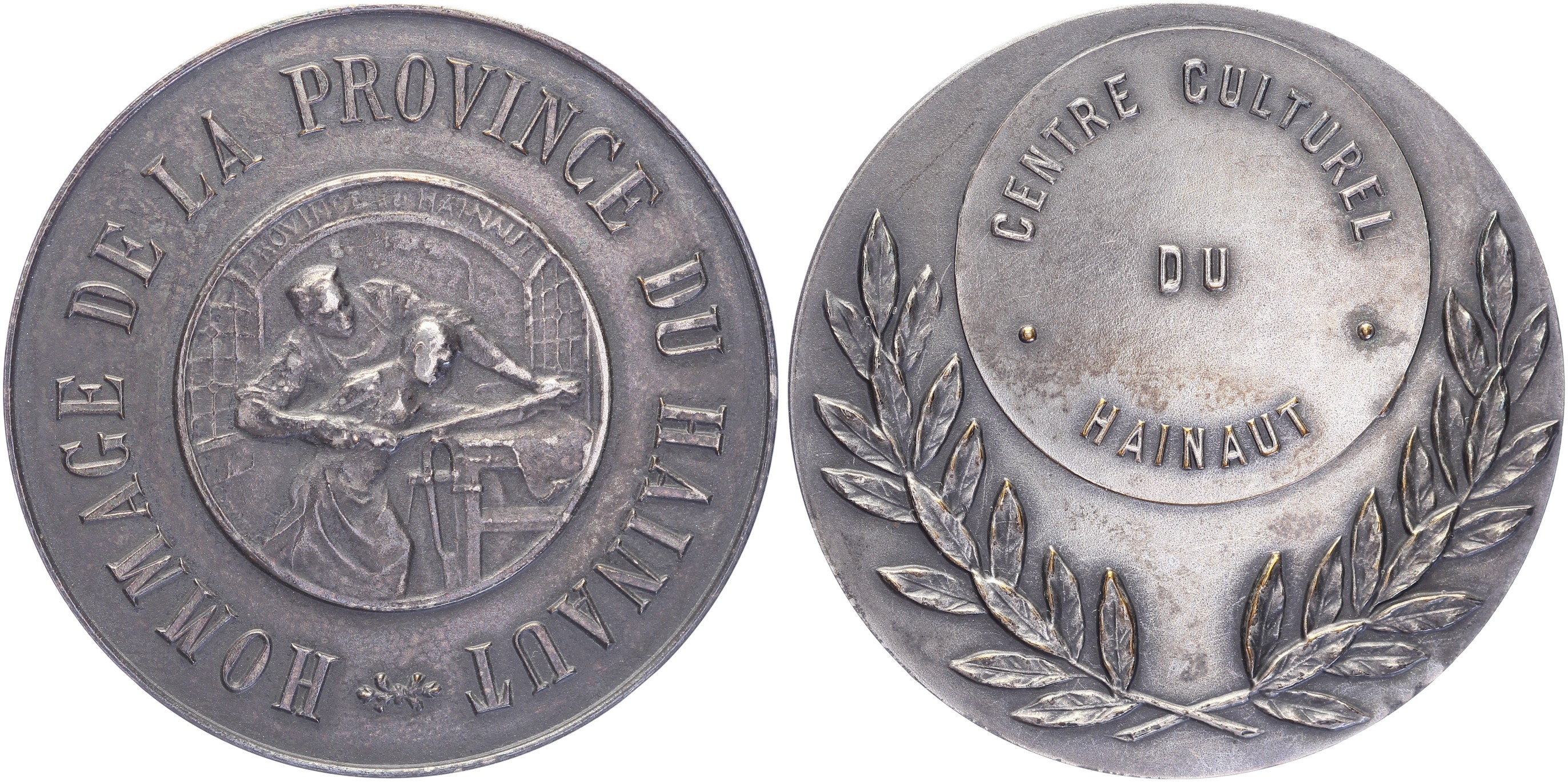 (1910) Provincieraad Henegouwen. Jonge & oude arbeider in leerlooierij (vz1). / Tekst in cirkel boven lauriertakken (kz1). Æ verzilverd 50. In originele doos. Willenz 97; PVD 106. Prachtig.