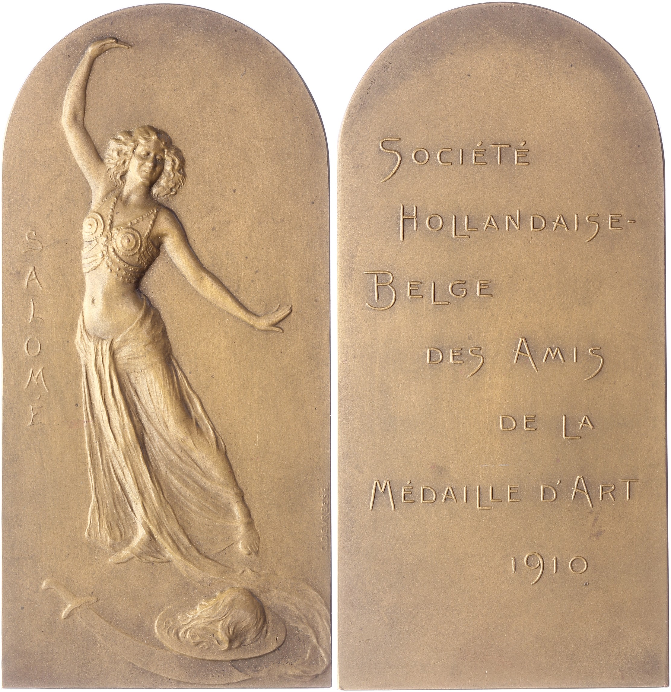 1910 Salomé. Dansende Salomé met hoofd v.d. heilige Jean-Baptiste en kromzwaard. / Zevenregelig opschrift. Æ 93 x 44,5 met gebogen bovenkant. Buchet/Toussaint 22; Willenz 100; PVD 109. Prachtig.