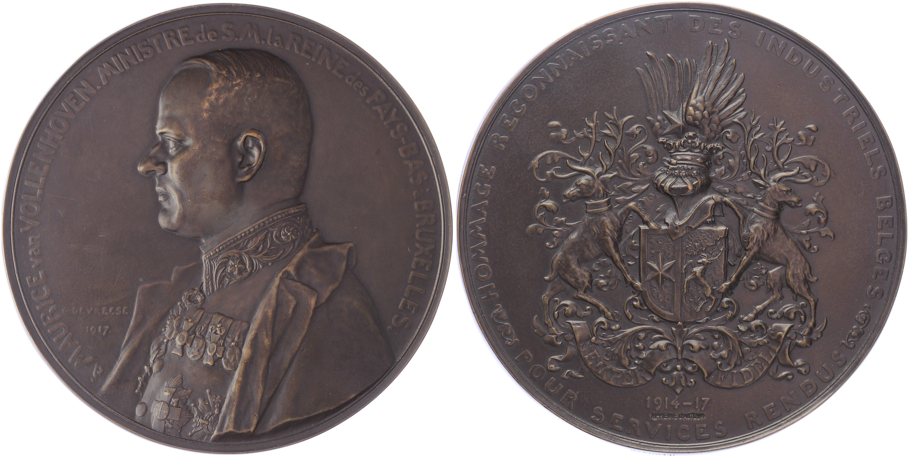 1917 Ter ere van Maurice van Vollenhoven, Nederlands diplomaat. Buste, vol met eretekens, naar links. / Familiewapen. Æ 75,5. Willenz 182; PVD 196. Prachtig.