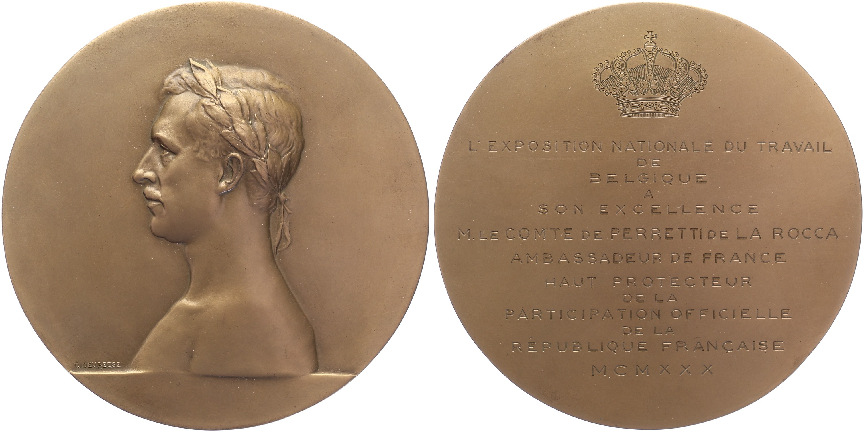 1930 Nationale werktentoonstelling. Naakte buste Albert I naar links met lauwerkrans. / Dertien-regelig opschrift gewijd aan de Franse ambassadeur M. Le Comte de Perretti de la Rocca. Æ 91 in originele doos. W. ―; PVD pag. 354/355. Zeldzaam. Prachtig.
