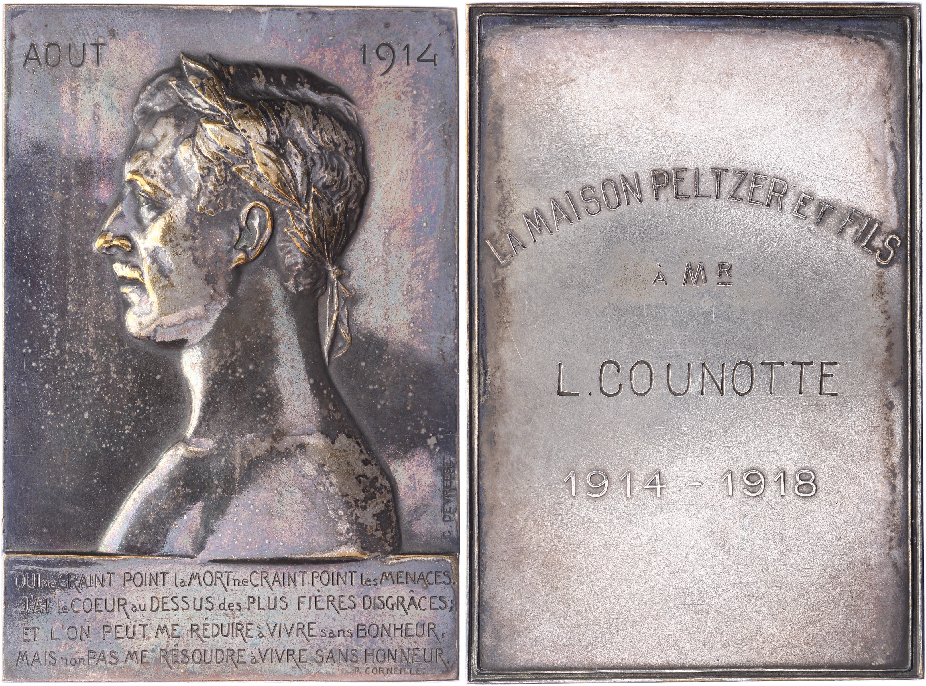 1918 Erepenning Maison Peltzer et Fils. Naakte buste Albert I naar links; vierregelig opschrift in afsnede. / Tekst. O.n.v. L. COUNOTTE (kz4). Æ verilverd 91,2 x 61,7. Willenz 185; PVD 199. Zfr.