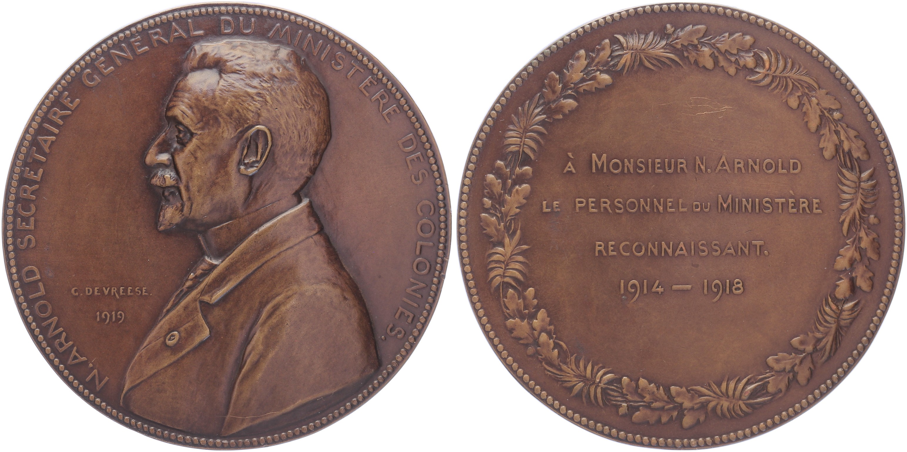 1919 Ter ere van Nicolas Arnold, minister van overzeese gebiedsdelen. Buste naar links. / Vierregelig opschrift binnen bladerkrans. Æ 69,9. Willenz 210; PVD 229. Prachtig.