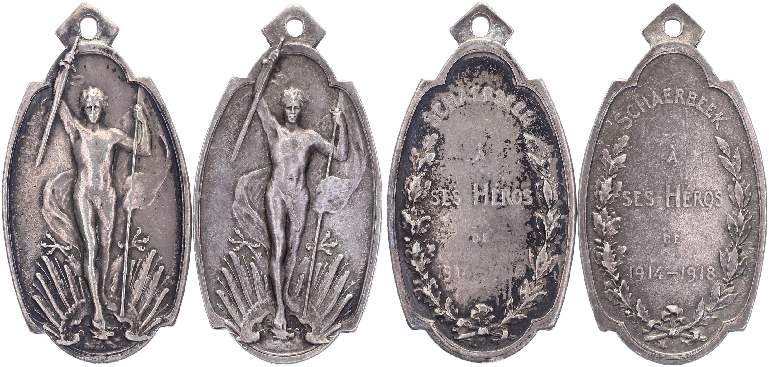 Lot (2) 1919 Schaarbeek aan zijn helden. Naakte staande man met zwaard en vaandel. / Vijfregelig opschrift. Æ verzilverd 45 x 23 met draagoog. Willenz 213; PVD 231. Zeer fraai + prachtig.