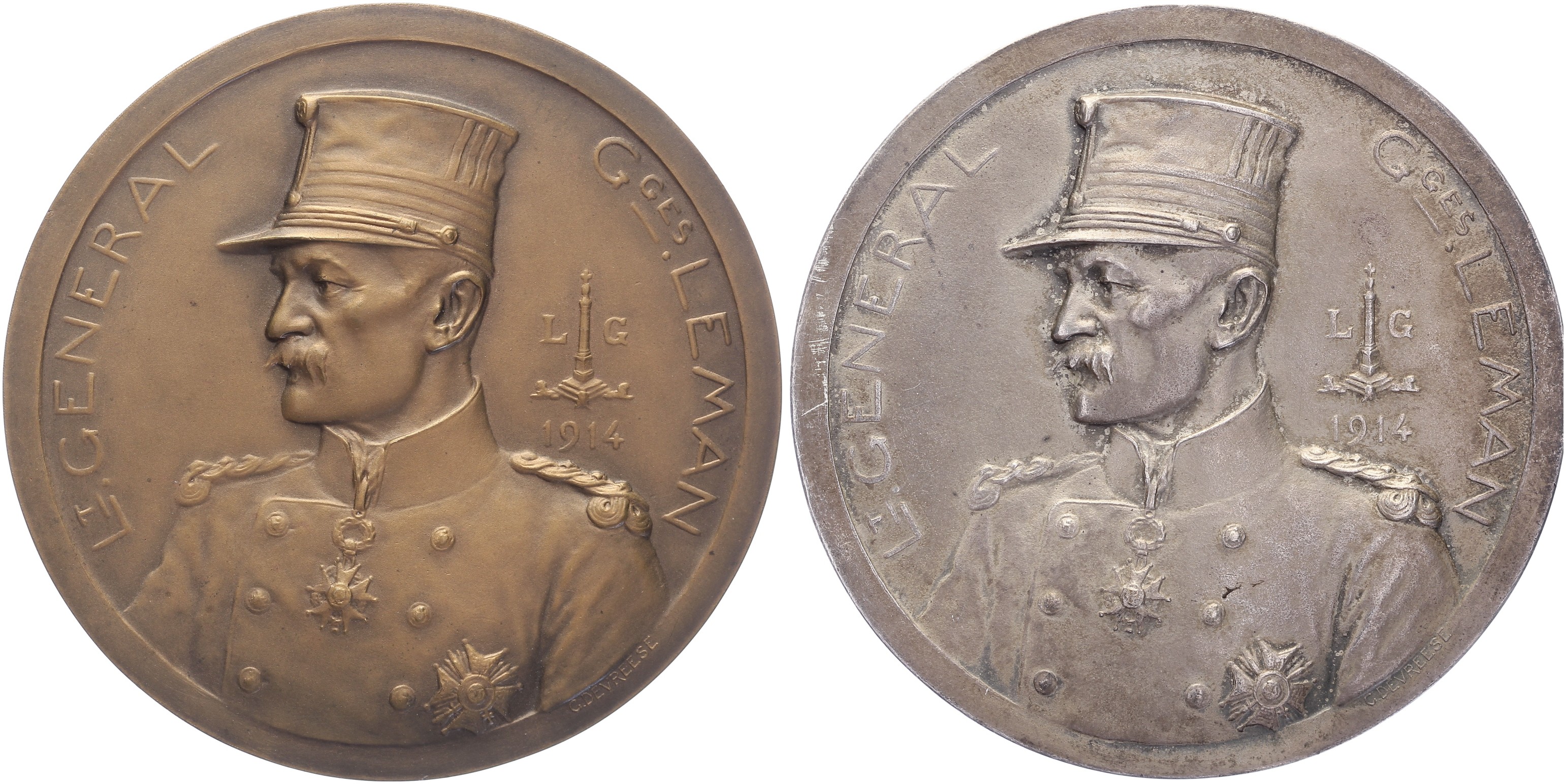 Lot (2) (1920) Ter ere van luitenant-generaal Georges Leman. Buste in uniform naar links. / Gesneuvelde soldaat. Æ + Æ verzilverd 70. Willenz 152; PVD 232. Prachtig.