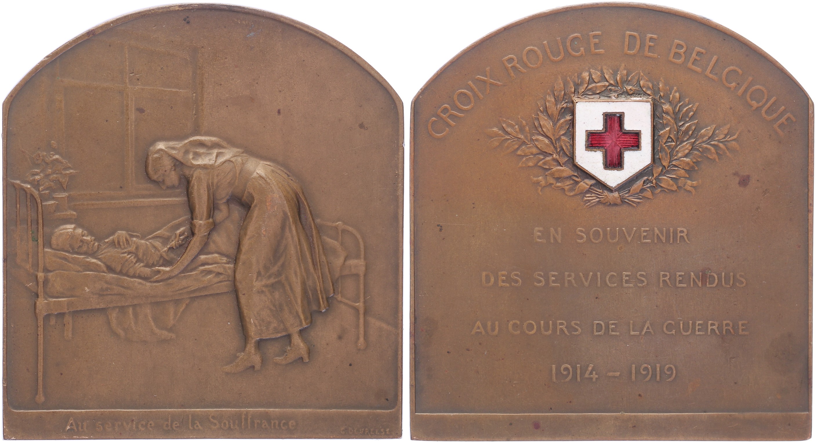 1919 Het Rode Kruis van België. Verpleegster verzorgt patiënt. / Geëmailleerd embleem. Æ 69 x 64 met gebogen bovenkant. Willenz 216; PVD 234. Prachtig.