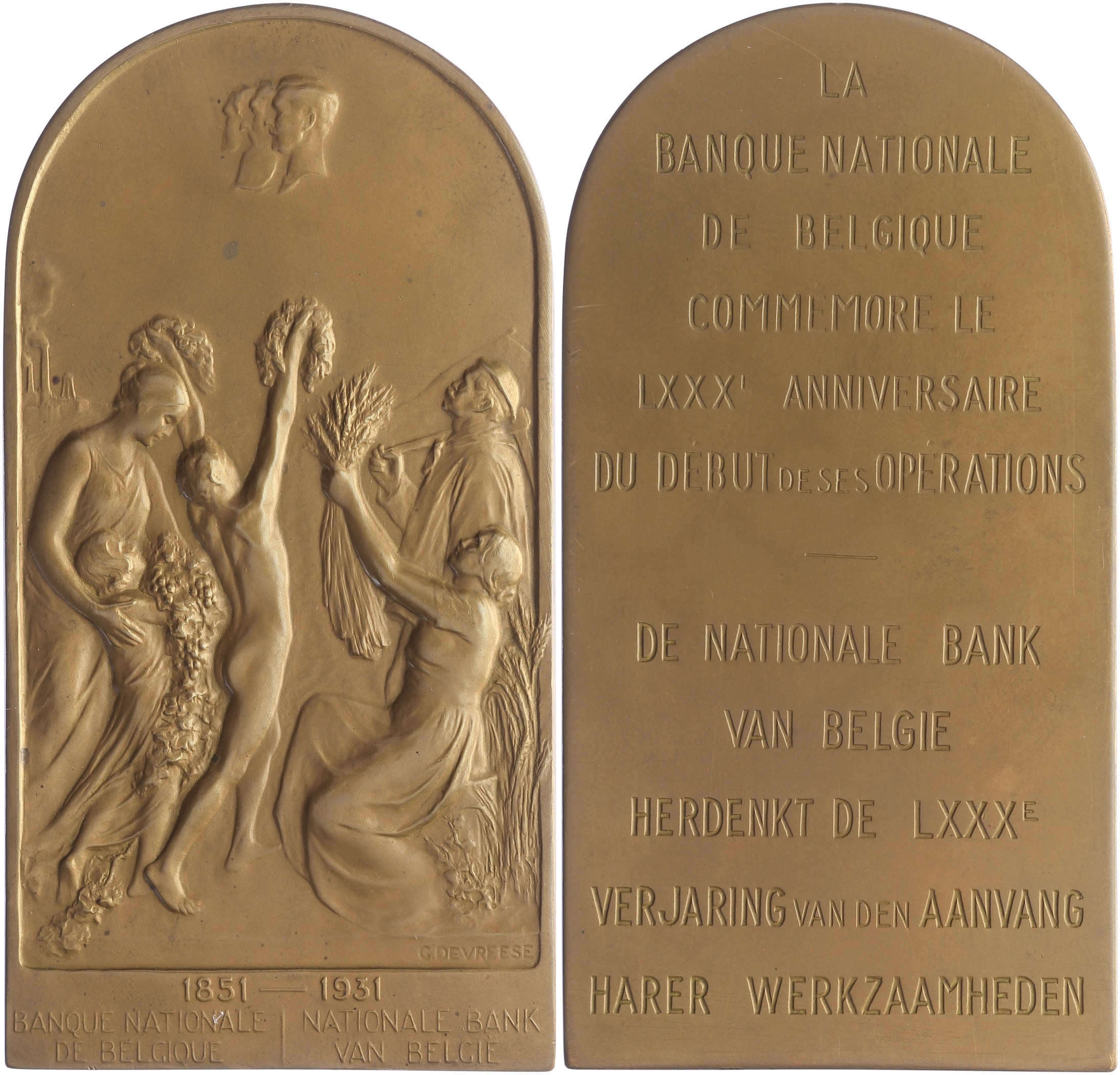 Lot (2) Nationale Bank van België 80 jaar. Vijf personen kijken omhoog naar miniatuur drieportret Belgische koningen. / Elfregelig opschrift. Æ 91,4 x 47,6 met gebogen bovenkant. Willenz 342; PVD 363. Prachtig.