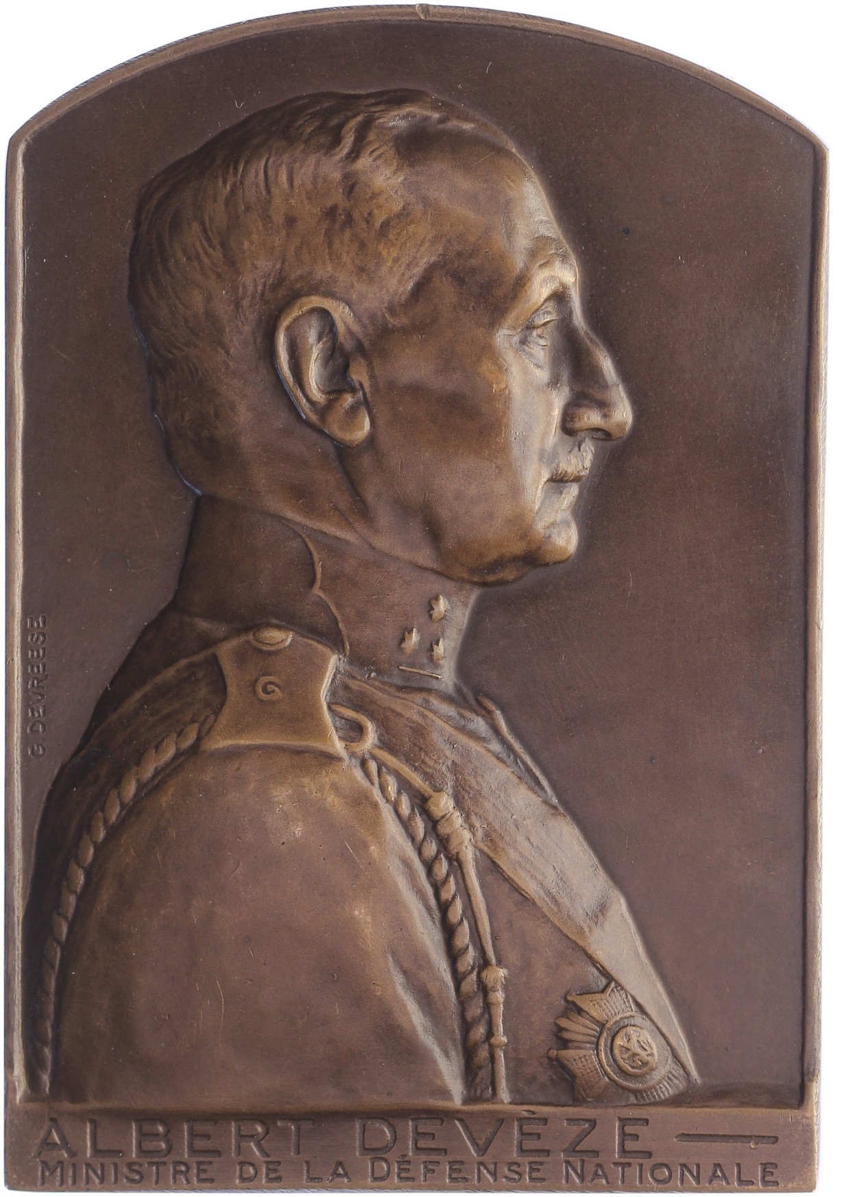 (1933) Ter ere van Albert Devèze, minister van defensie. Buste naar rechts. / Blanco. Æ 75,4 x 52,4 met gebogen bovenkant. Willenz 367; PVD 385. Prachtig.