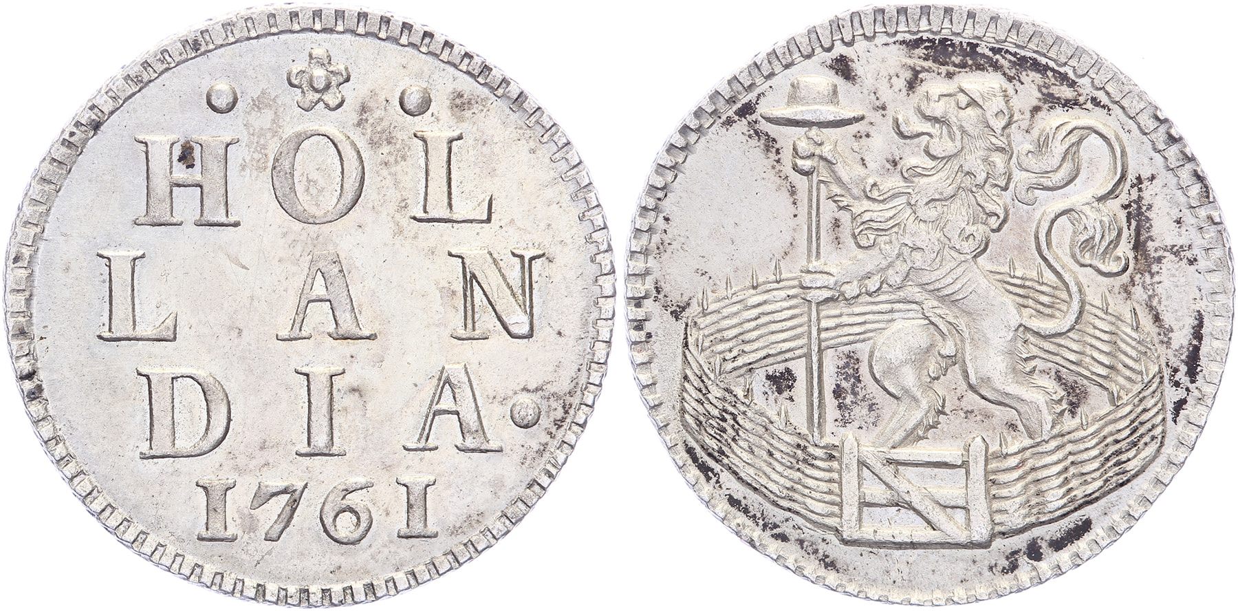 Duit 1761, afslag in zilver van 2,88 gram. PW 2007.5; CNM 2.28.126; HPM 84.3. Prachtig.