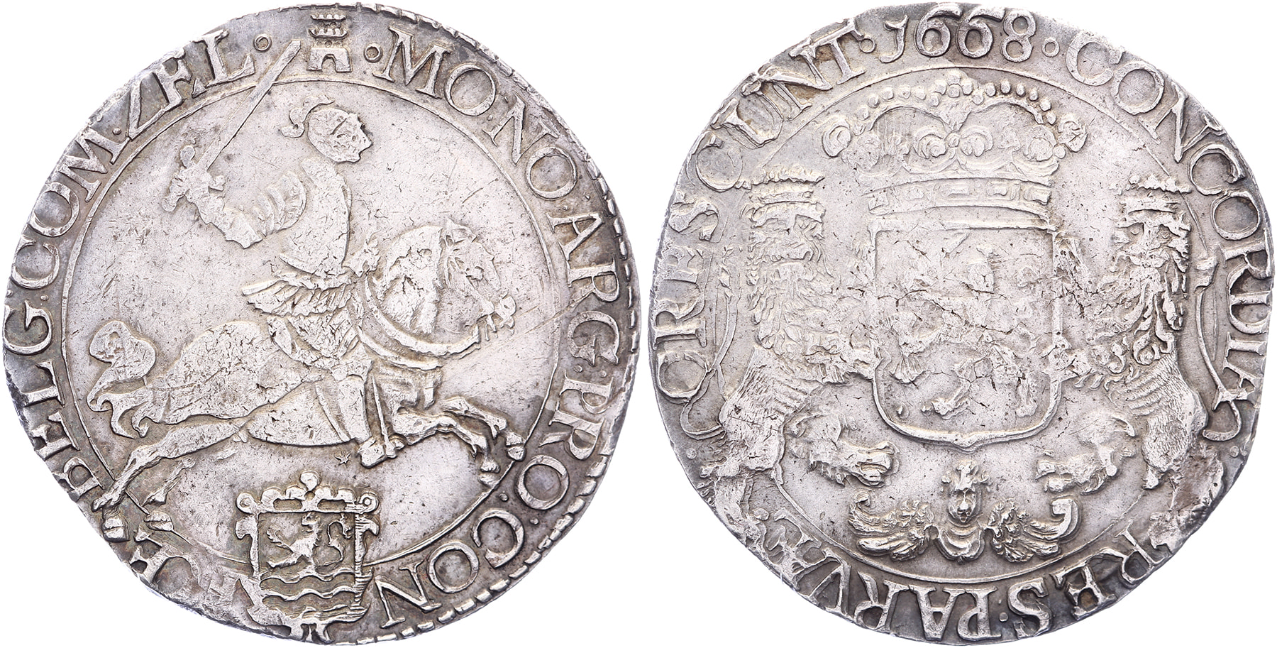 Rijder of dukaton 1668 met engelenkopje onder Generaliteitswapen. Delm. 1024; CNM 2.49.56; HPM 43.1. Bijna zfr.