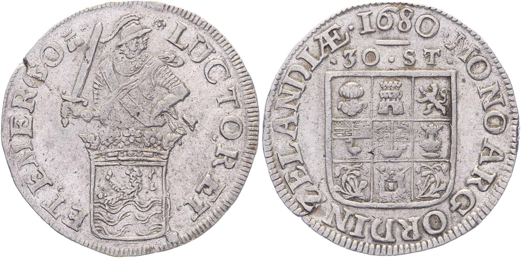 Daalder van 30 stuiver 1680. Delm. 1082; CNM 2.49.65; HPM 61. Iets afwijkende stempels, minimale uitbraak rand. Ruim zeer fraai.