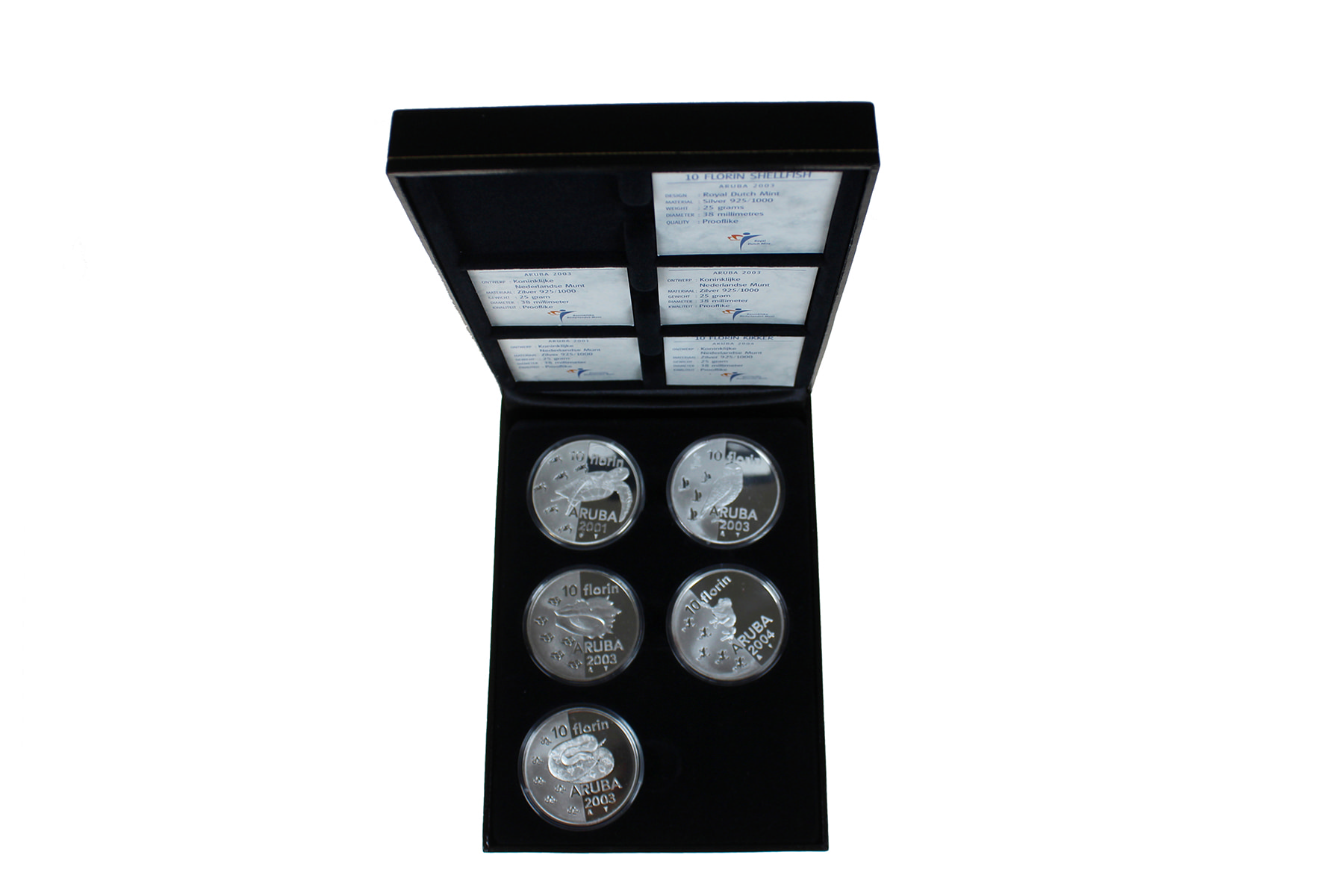 Set van 5 x 10 Florin: 10 Florin 2001 - Schildpadden; 2003 - Schelpdieren; 2003 - Slangen; 2003 - Uilen; 2004 - Kikkers. Proof in cassette KNM.