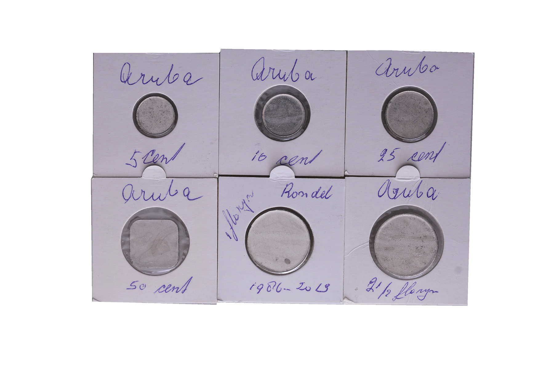 Lot (8) blanco muntplaatjes van 5 cent – 10 cent – 25 cent – 50 cent – 1 florin – 2 ½ florin – 5 florin (2).Toegevoegd: Misslag van 10 Cent 1989; 2 ½ Florin 1991 muntslag.