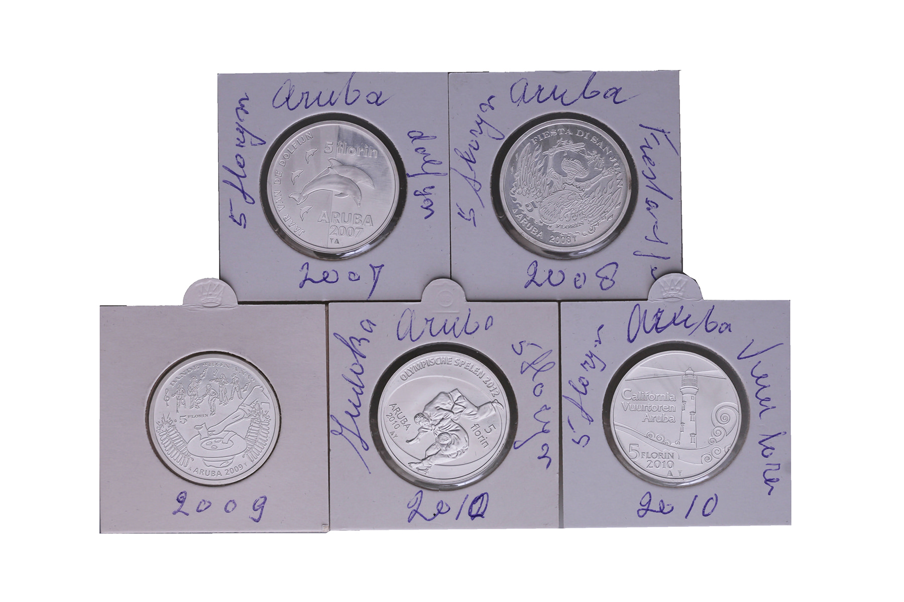Lot (5) 5 Florin 2007 - Dolfijnen; 2008 - Fiesta San Juan; 2009 - Dande; 2010 - Olympische Spelen London; 2010 - Vuurtoren. Diverse kwaliteiten.