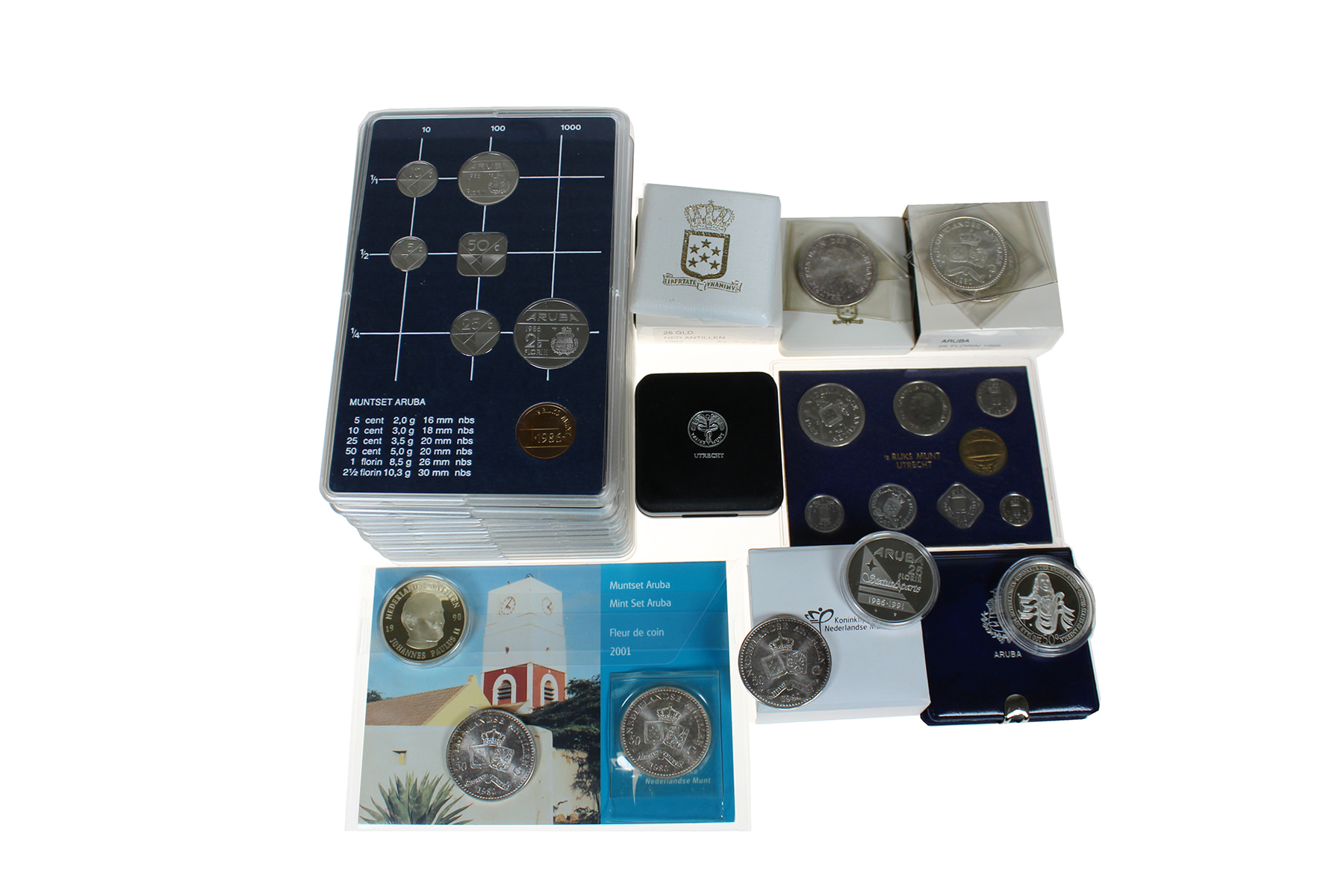 Doos met lot overzeese gebiedsdelen, voornamelijk Aruba en Nederlandse Antillen. Ca. 15 x FDC-sets en ca. 15 x zilveren herdenkingsmunten van 10 – 25 en 50 gulden.