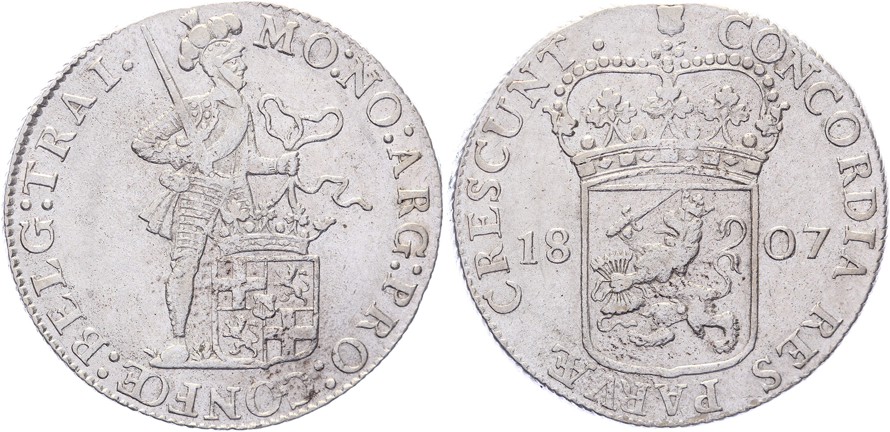 Dukaat of rijksdaalder 1807. Lint onder de R van ARG; de 7 uit het jaartal bij IA. LSch. 137; Sch. 122. Ruim zeer fraai.