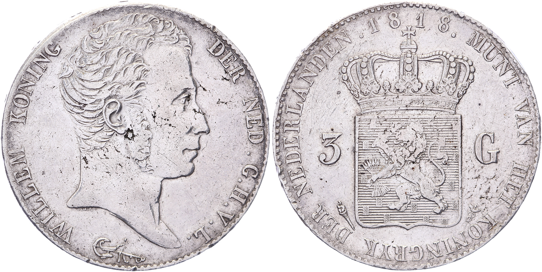 3 Gulden 1818 Utrecht, mmt. fakkel LSch. 253; Sch. 240. Tikje rand Fraai / Zeer fraai